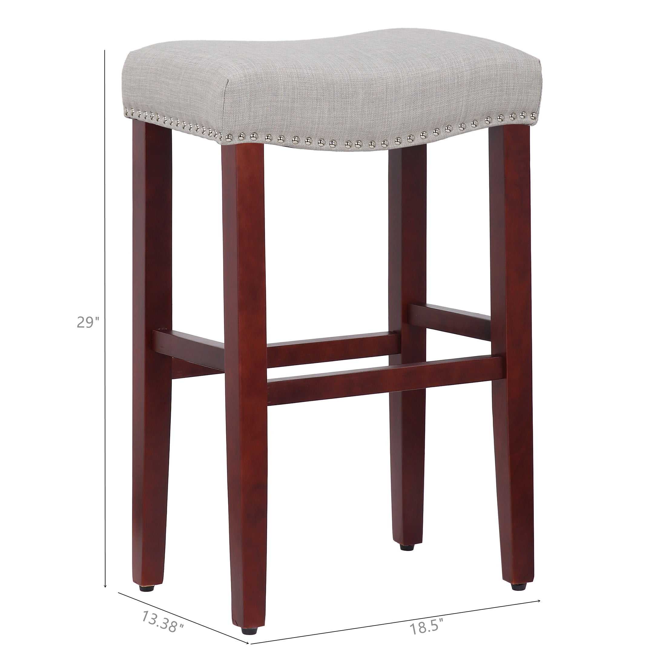 Ideal for your kitchen and home bar, this 29 Inch stool will bring you style and comfort with its well-cushioned saddle upholstered seat. Crafted from high quality solid rubberwod, this bar stool boasts an undestated craftsmanship that makes it perfect for your kitchen, dining room, or bar area. Designed with comfort in mind, indulge yourself in the bar stool’s high denisty foam cushioning. Featuring a linen seat, polished chrome nail head trim, and cherry stained wood legs with perfectly placed footrest.