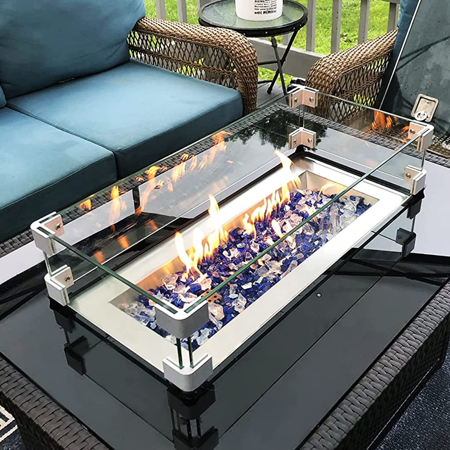 Rectangular Fire Pit Wind Guard Our rectangular fire pit wind guard is a must-have accessory to prevent flames from blowing around and serve as a safety barrier, ensuring protection from the fire. Additionally, it adds elegance to your fire pit by reflecting the beauty of the dancing flames off the glass. Specifications: – Glass Material: Tempered Glass – Bracket Material: Aluminum – Glass to Glass Dimensions: 29″ x 13″ x 6″ (Length x Width x Height) – Thickness: 5/16″ (8mm) – Assembly Required: Yes Package Includes: – Windscreens ×4 – Upper Fixing Clips ×4 – Bottom Fixing Clips ×4 – M10 Screws ×16 – Spacers ×16
