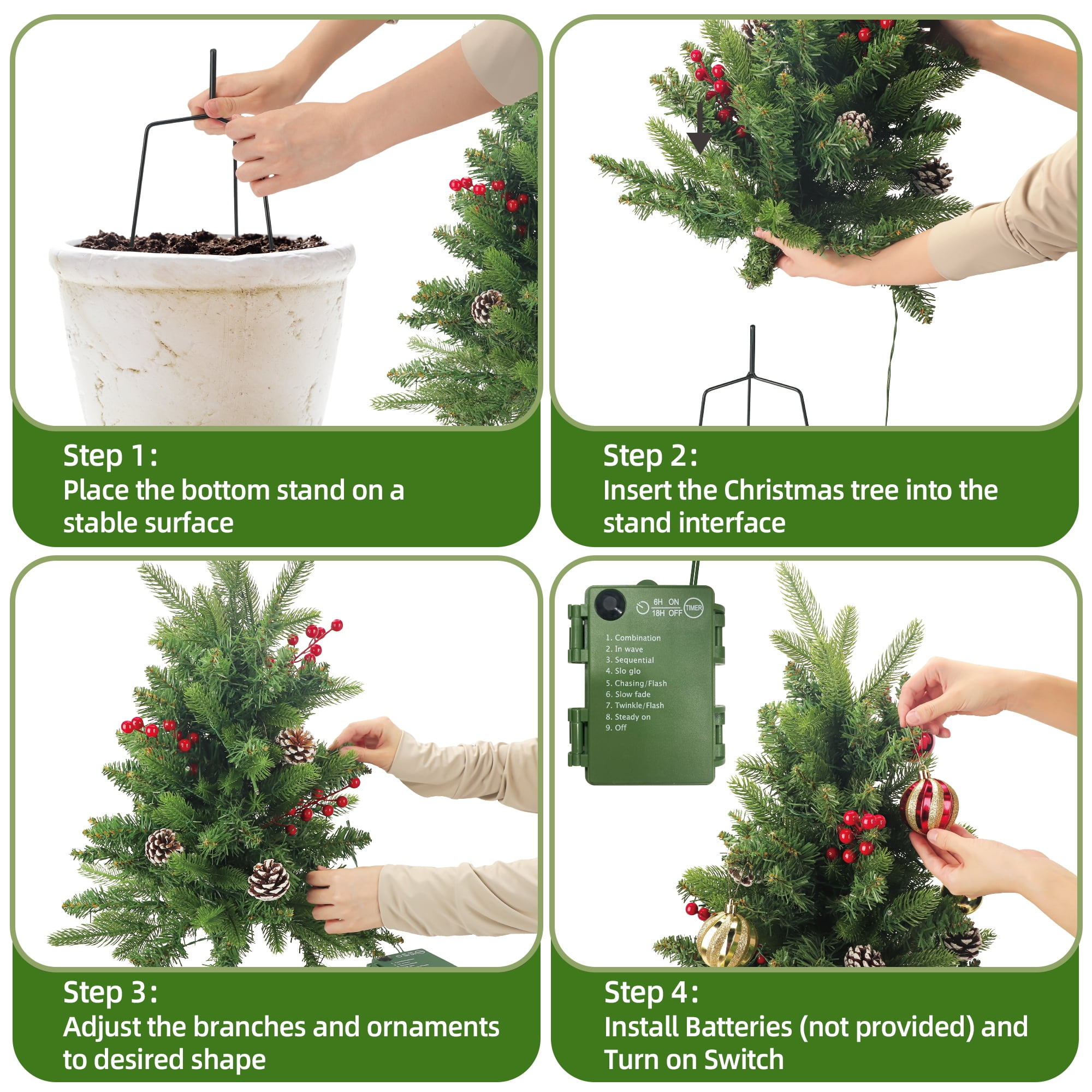 Set of 2, 30 Inch Pre-decor Lighted Christmas Tree: This set includes two 30-inch pre-lit and pre-decorated Christmas trees adorned with red berries, pine cones, and Christmas ornaments, perfect for adding a festive touch to your home or outdoor Christmas decorations. 120 LED Super Bright Warm White: Each tree is adorned with 60 warm white LEDs that create a super bright, cozy glow to enhance your holiday decorations. The light strips are powered by a battery box, requiring no outlet, can be placed anywhere. (Batteries not included) 8 Mode Lighting and Timer Function: Offers various lighting effects, including steady and flashing modes. Auto 6 hours on 18 hour off, set it up and forget it, these little Christmas tress will automatically lights up for 6 hours and then turns off for 18 hours. Easy to Assemble & Durable for Outdoor: Crafted from eco-friendly materials, including flame-retardant PVC & PE branch tips and stable triangular stand. These Christmas trees are very easy to set up, simply loosen the branches to create a lovely Christmas tree. Ideal for garden, front door, yard, porch, pathway, flowerpot. Pre-Decorated with Ornaments, Pine Cones, and Red Berries: Each Christmas tree is pre-decorated with 10 ornaments, 4 pine cones, and 4 red berries, so you can save time and effort on your holiday decorations. More Details You May Want to Know Light Color: Warm White LED Quantity: 60 LED*2 Height with Stake: 30 inch Accessories: 10*2 Ornaments, 4*2 Pine Cones, 4*2 Red Berries Material of the Tree: PVC & PE Is it handcrafted? : Yes Package Include: 2 Pcs Christmas Trees 20 Pcs of Christmas Ornaments 2 Pcs Triangular Stands 2 Led Light Strips (attached on the tree)