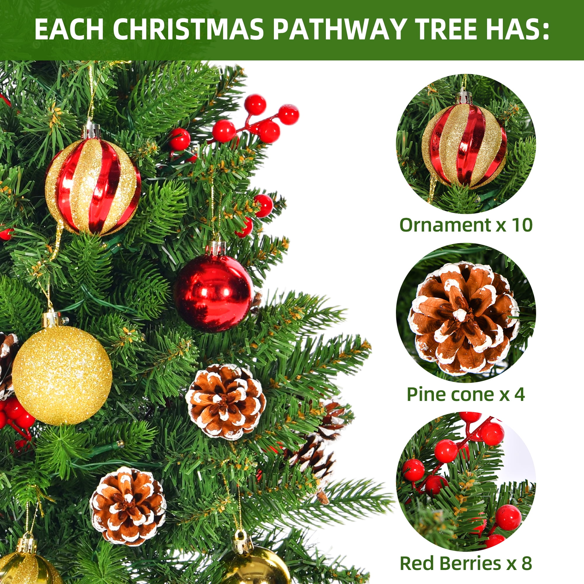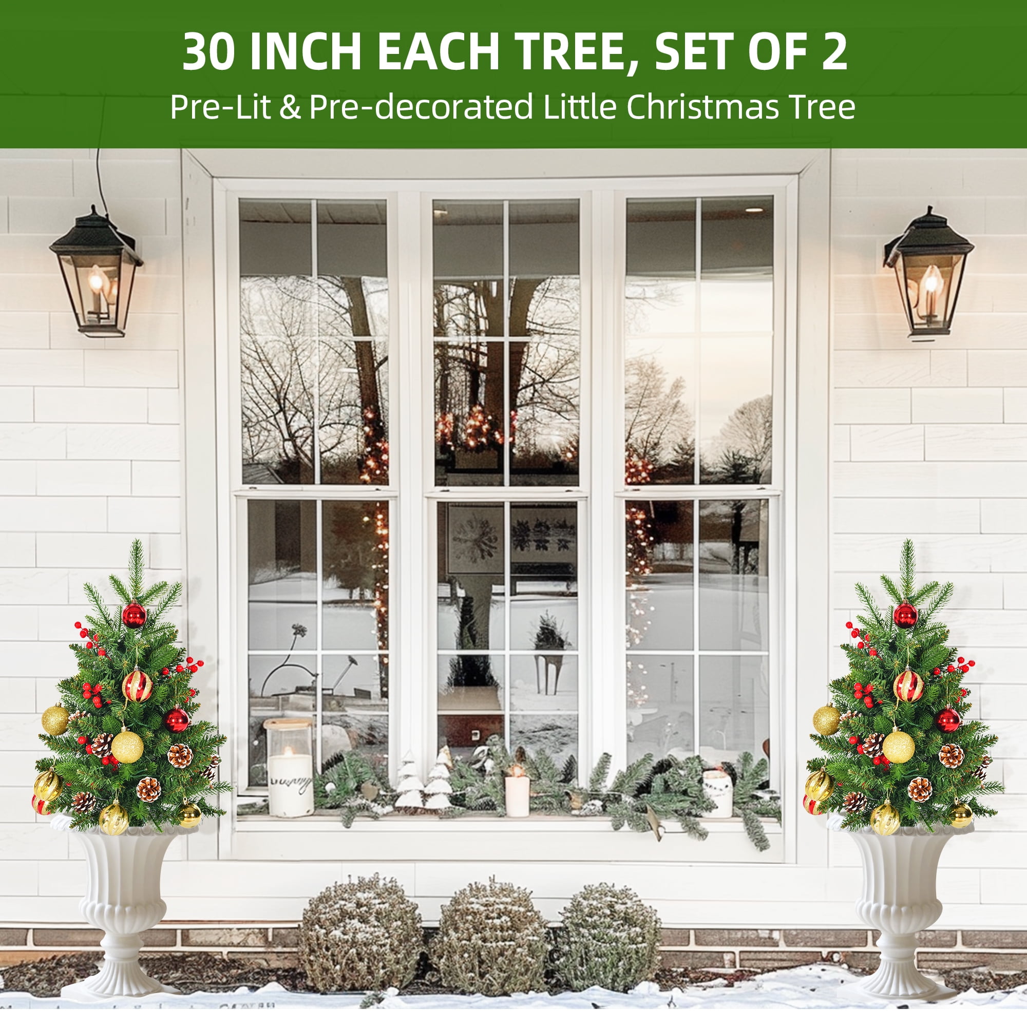 Set of 2, 30 Inch Pre-decor Lighted Christmas Tree 120 LED Super Bright Warm White LED 8 Mode Lighting and Timer Function Easy to Assemble & Durable for Outdoor Pre-Decorated with Ornaments, Pine Cones, and Red Berries