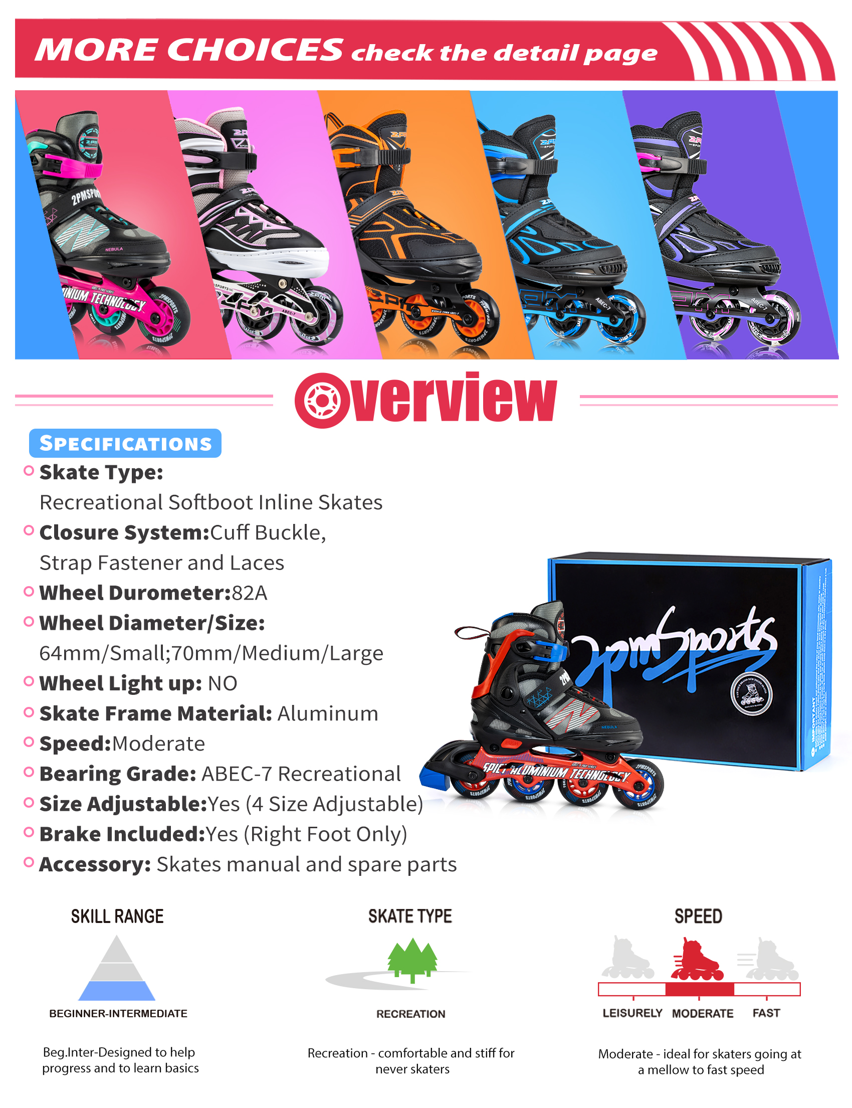 【Adjustable inline skates-(order after confirming the size)】 Our inline skates have 3 different Unisex sizes, S/M/L, each of which is adjustable. Please confirm the correct size through the attached size chart. After receiving the roller skates, you can also use the adjustment button to easily adjust the size to fit. 【Safety and Comfort】Our children’s inline skates have a triple protection system, including cam lever buckles, belts and laces. The aluminum alloy frame provides safe ankle support, and the inner boots are breathable, comfortable and refreshing. In addition, the inner lining is also designed to be placed strategically to improve the skating experience. This can keep your feet in a comfortable package and reduce foot fatigue, thereby making roller skating longer and more enjoyable. 【Premium Performance】Enjoy a smooth, quiet and confident ride on the reinforced aluminium frame and rubber(TPR) stopper, 82A polyurethane wheels and high quality ABEC-7 bearings. An easy system to get in and out of the skate quickly and nicely, even your girls can do by herself. 【The Perfect Holiday and Birthday Gifts for Girls and Boys】If you are worried about what gifts to give your kids, our skates must be the best choice. Surprising gifts such as birthday gifts, holidays, special events and milestones for boys and girls, children scream with excitement and joy. 【Devoted Customer Service and After-Sales Protection】 Your child’s safety and your satisfaction are our pursuit. Contact us if you are not satisfied with our product, you will receive 100% customer support and quality assurance. If there are any quality problems, we promise to replace or refund for you