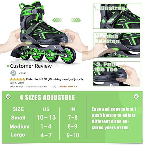 Vigorous Color – When vibrant green meets classic black, this color match is so eye-catching. I bet you have already fallen in love with this stylish, awesome design. Perfect Birthday Present and Holiday Gifts – Inline Skates are loved by children of all ages and fun for adults, too. Leave the video games and phone inside. Enjoy hours of outdoor fun, Let’s go outside and play! 4 Sizes Adjustable – Total 4 segment for you to adjust, every 0.2 inch has its own size. The shoe will be the exact fit as kid’s feet grow. Feel comfortable more than ever before! Three size available: Small for little kid(11-1); Medium for big kids(1-4); Large for youth & young adult(5-8) Premium Performance – Enjoy your smooth, quite and confident ride with high quality ABEC-7 bearings, 82A polyurethane wheels, aluminum frame and rubber(TPR) stopper. Tripple protection including laces, 45° Strap and high-strength buckle are sure to provide safe ankle support and protect you along the way. Sincere Service – Order with confidence due to our 100% dedicated customer and product experience. Every question or problem will be answered and solved nicely and promptly. If you’re not 100% satisfied for any reason, simply return for a FULL REFUND with no questions asked. Click the Add to Cart button now. You’ll be happy you did!