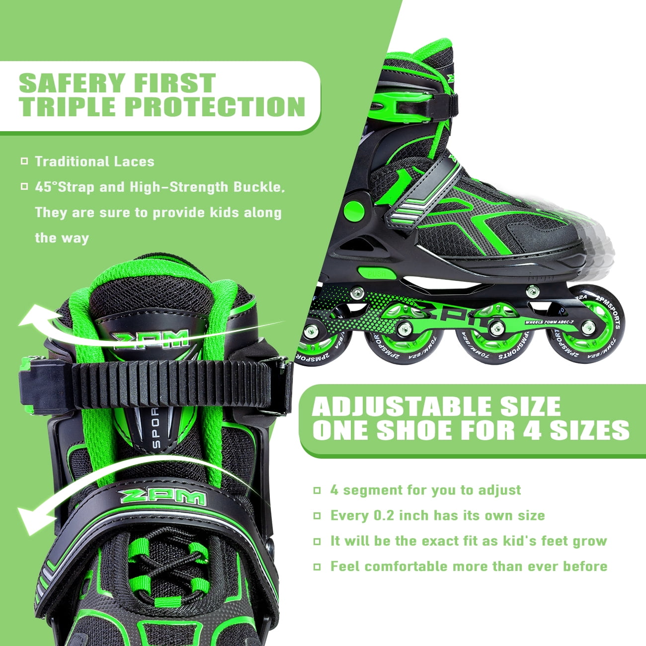 2PM SPORTS Unisex Adjustable Inline Roller Skates, Green and Black, 5.31 in