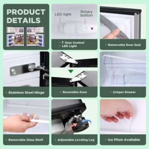 USER-FRIENDLY DESIGN – LED interior fridge light makes you easier to find things at night. Adjustable feet of mini fridge help adapt to uneven surface. 2 Reversible Door. The crisper drawer is designed for your separate vegetable or fruits. Adjustable glass shelf of mini fridge makes it more convenient to place taller food or drinks. Provide you plenty of flexibility and increasing space utilization.