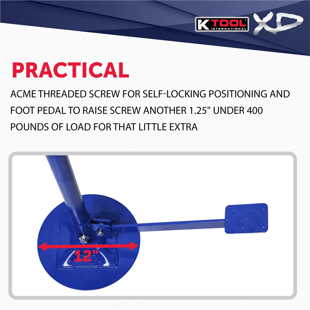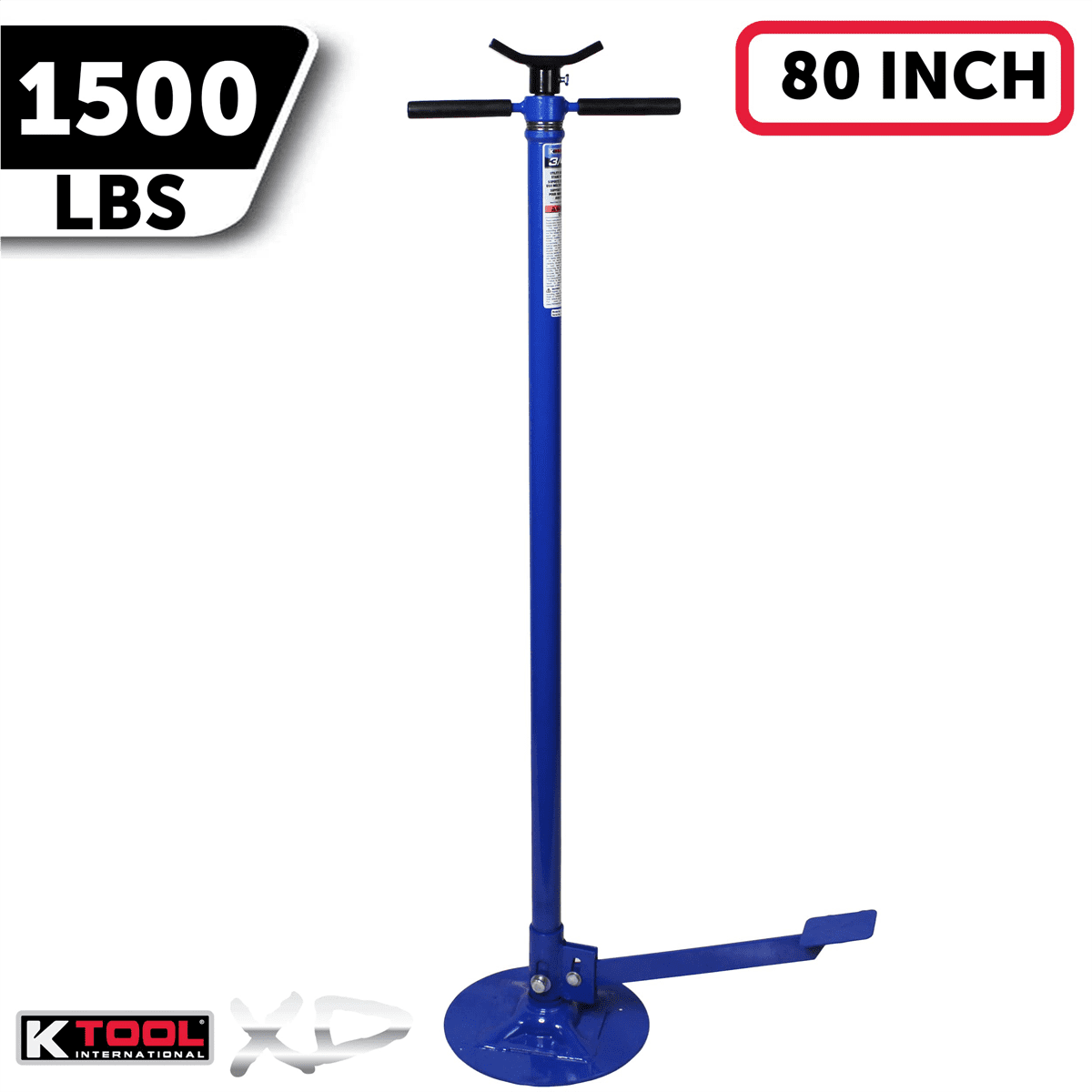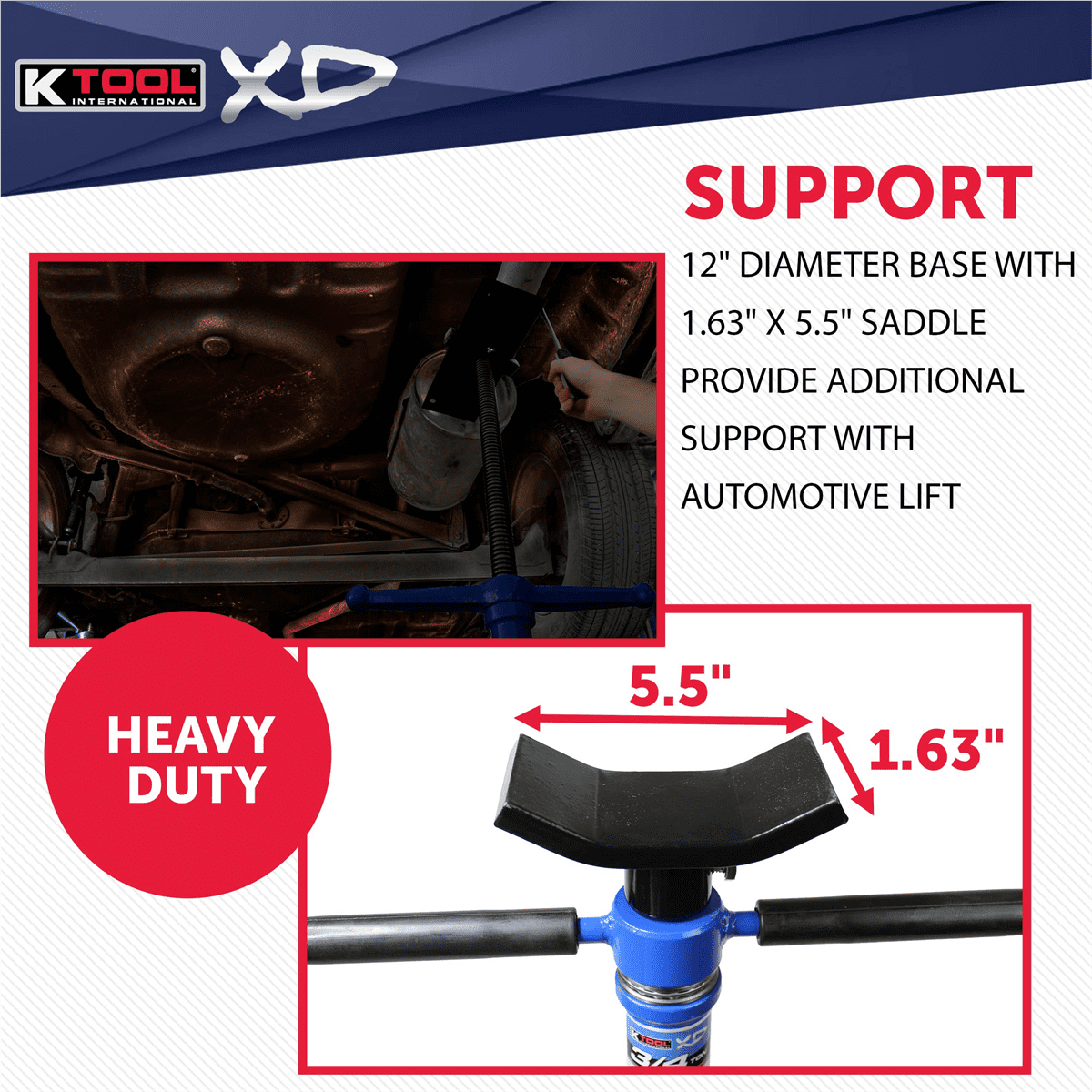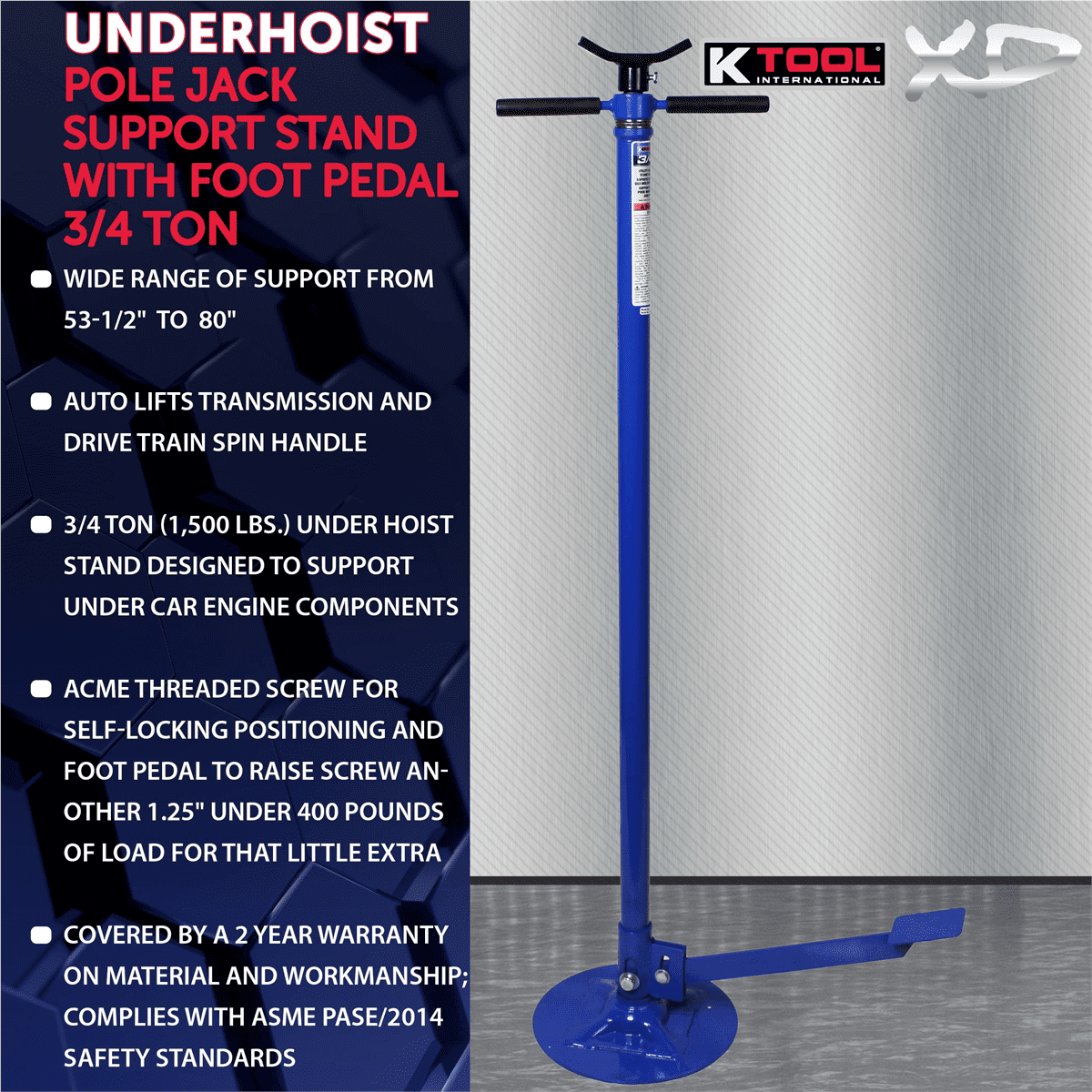 pstrongFeatures and Benefits: /strong/pul3/4 ton under hoist stand designed to support under car componentsliSupport range from 53-1/2″ to 80″/liliAcme threaded screw for self-locking positioning and foot pedal to raise screw another 1.25″ under 400 pounds of load./liliBearing mounted spin handle for easy raising and lowering of screw/lili12″ diameter base with 1.63″ x 5.5″ saddle provide additional support/libr/pspan arial”,sans-serif”=” style=”font-size:9pt;”/span/p3/4 ton KTool XD under hoist stand designed to support under car components. Support range from 53-1/2″ to 80″. ACME Threaded screw for self-locking positioning and foot pedal to raise screw another 1.25″ under 400 pounds of load. Bearing mounted spin handle for easy raising and lowering of screw. 12″ diameter base with 1.63″ x 5.5″ saddle provide additional support. 2 Year Warranty on material and workmanship. Complies With ASME PASE/2014 Safety Standards. Underhoist stands work by holding up your work from the bottom. They are thin and easily portable, allowing you to set them up when you need them and store them anywhere when you don’t./p