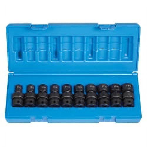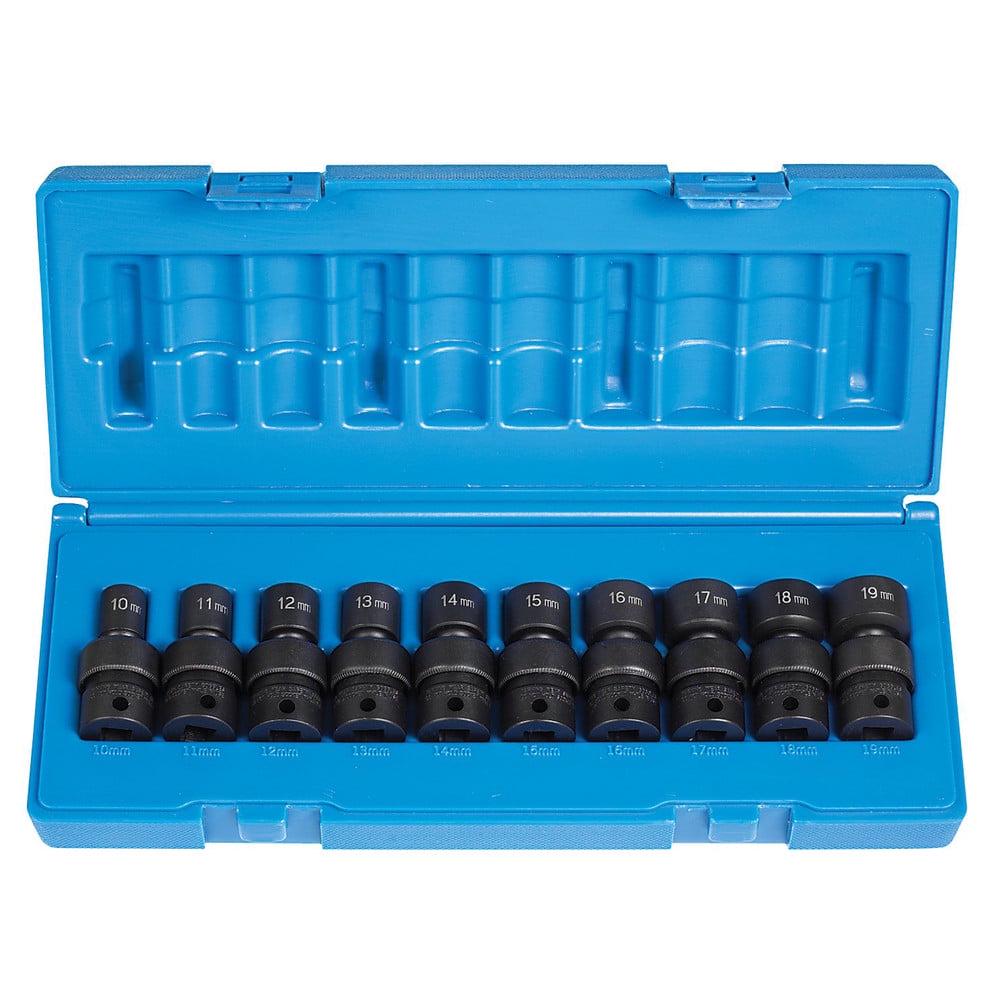 Each impact socket features high torque drives. This feature limits the amount of wear on the corners of the fastener and the socket. It also improves the strength of the socket, transfers increased torque to the fastener and allows easier access to tight areas. Each socket is thoroughly made with the correct balance of strength and durability and is tested to the highest specifications to deliver outstanding performance at the most competitive cost. Set includes sizes: 10mm, 11mm, 12mm, 13mm, 14mm, 15mm, 16mm, 17mm, 18mm and 19mm.