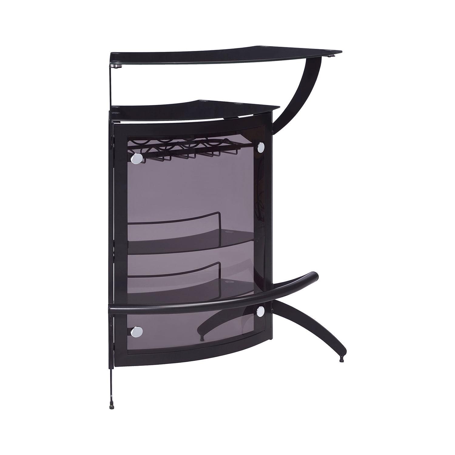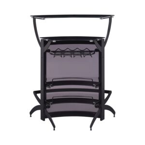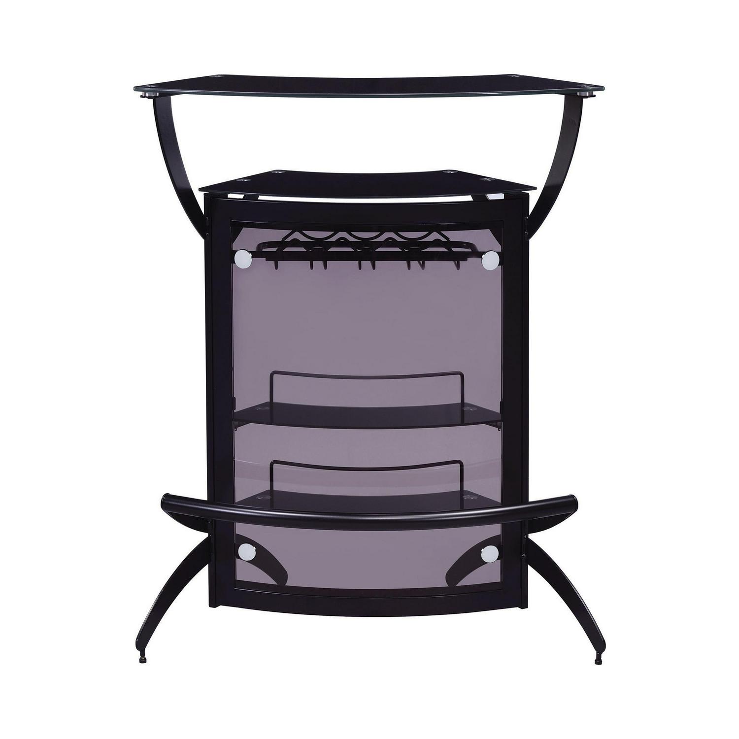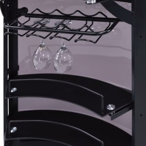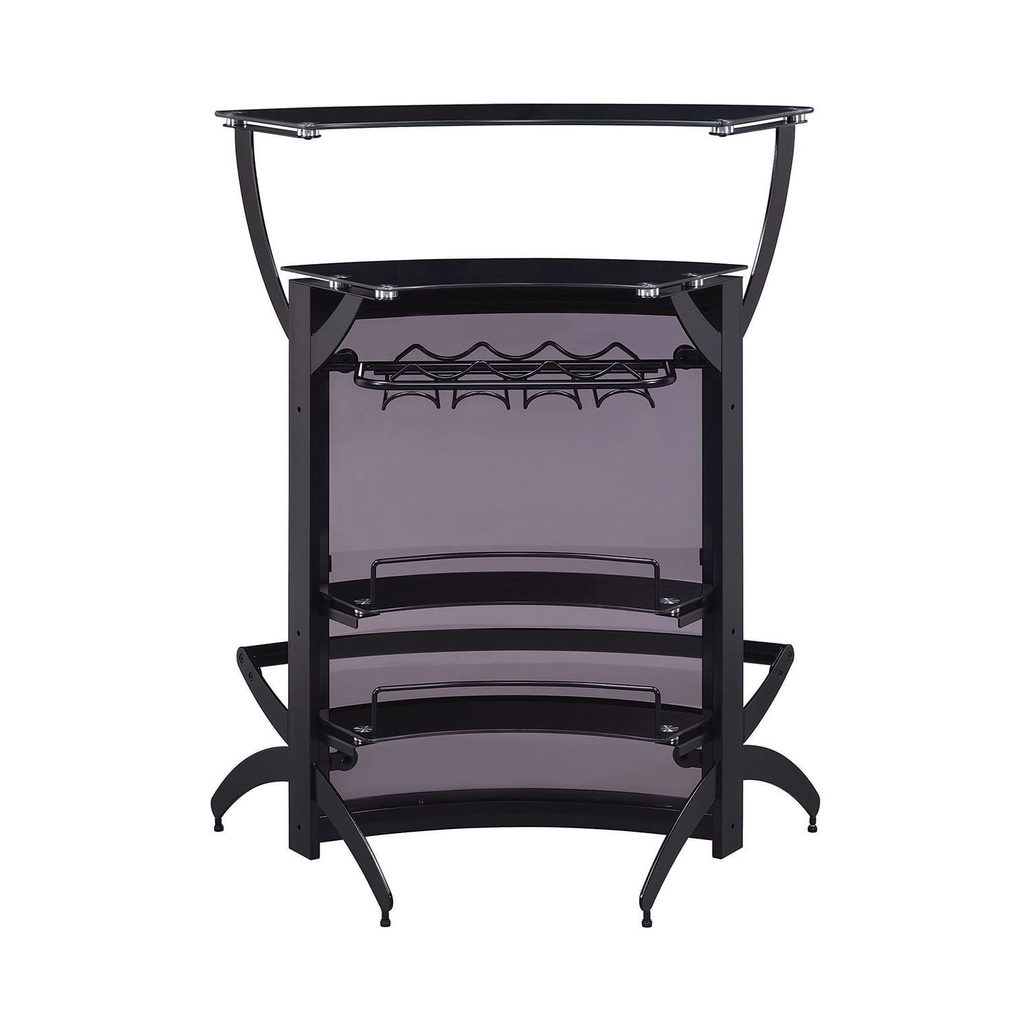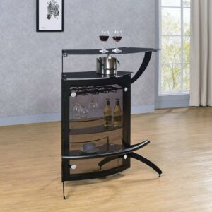 Heavy on the modern elegance scale, the design of this elegant bar unit turns heads as it provides comprehensive serving and entertaining functions. Enjoy a lovely smoked acrylic with black tempered glass and black metal frame, combining to offer a sophisticated ambiance. With two-tier black tempered glass tops and two identical shelves, storage and service are easy. A stemware rack and wine rack holding three bottles creates a perfect setup for intimate gatherings. Entertain in a modern space with the confidence and utility of this exceptional bar unit.