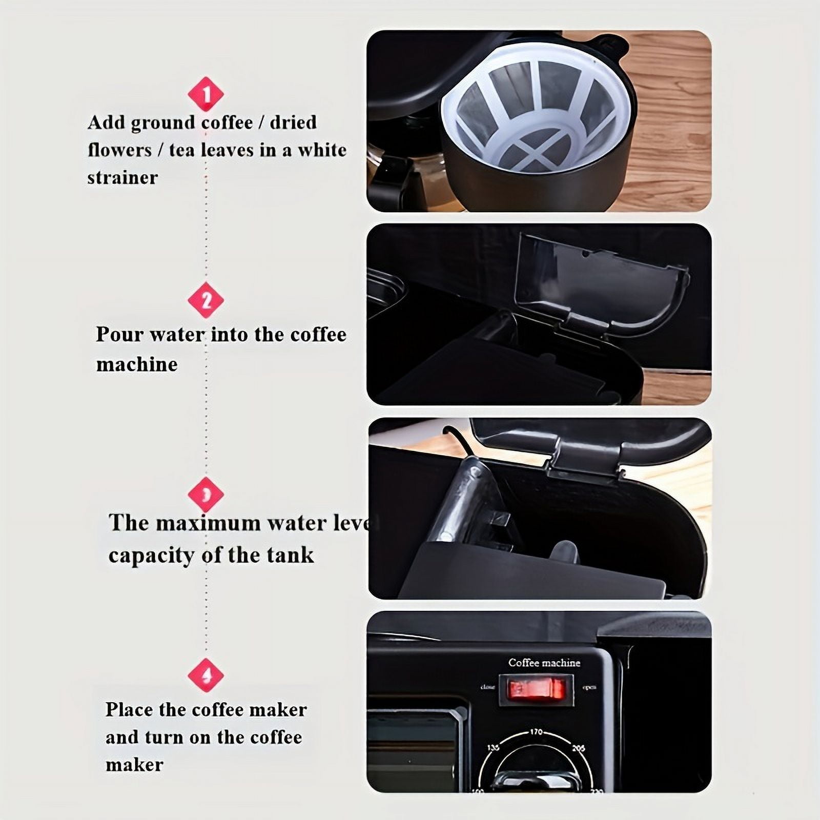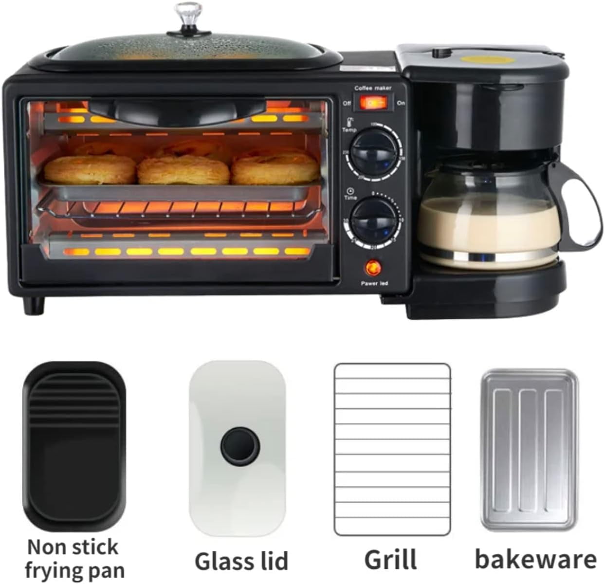 Maestri House 3-In-1 Breakfast Station- Coffee Maker, Toaster Electric Oven and Electric Griddle Combo Description: All-in-one Breakfast Solution: Start your day off right with our versatile breakfast station. This 3-in-1 appliance includes a 4-cup coffee maker, a large griddle for cooking eggs, bacon, and pancakes, and a toaster oven that can hold up to four slices of bread. Space Saver: Our compact breakfast maker machine is designed to save countertop space while providing a convenient solution for cooking your favorite breakfast meals. The stylish design makes it a great addition to any kitchen decor. Coffee Maker: This coffee maker brews up to 4 cups at a time in minutes so you can enjoy a cup of coffee while your food cooks. It comes with a glass carafe, a coffee scoop, and a reusable filter. Family-Sized Griddle: The large non-stick griddle offers plenty of room to fry eggs, omelets, pancakes, sausages, bacon, hashbrowns, and other breakfast foods. It also comes with a glass lid. Cleaning: If cooking is not simple enough, the oven tray, wire rack, bread crumb tray and non stick baking tray are removable, making cleaning easier.