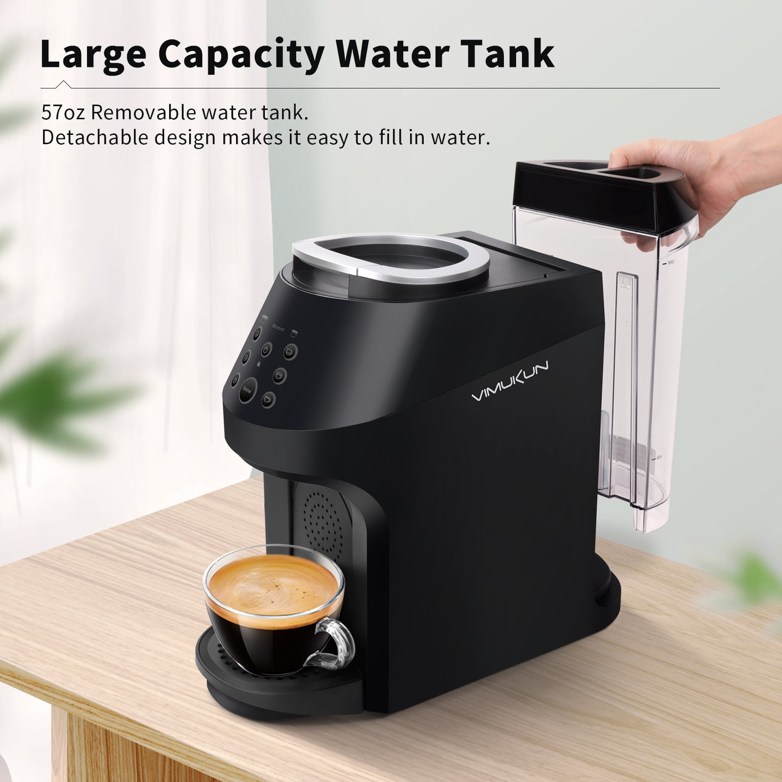 VIMUKUN 3-in-1 Coffee Maker for Nespresso, K-Cup Pod and Ground Coffee, which use improved BPA Free plastic as material to brew a cup of nice tasting coffee for you.This coffee and espresso machine combo lets you brew coffee 3 different ways, compatible with K-Cups/Nespresso pods, or your own coffee grounds with the reusable capsule. This coffee maker features a removable drip tray and water tank for easy cleaning and maintenance. With its large 57oz water reservoir, the pod coffee maker for K-Cup can brew up more than five cups of coffee at once, making it ideal for busy mornings or entertaining guests. And with 3 different K Cup size options (8, 10, and 12oz).The espresso coffee machine’s 19 bar pressure system delivers professional-grade espresso, with three modes for nespresso pods(Ristretto, Espresso, and Lungo) to choose from. With its fast brewing time, this coffee brewer lets you enjoy a hot cup of coffee in just one minute.