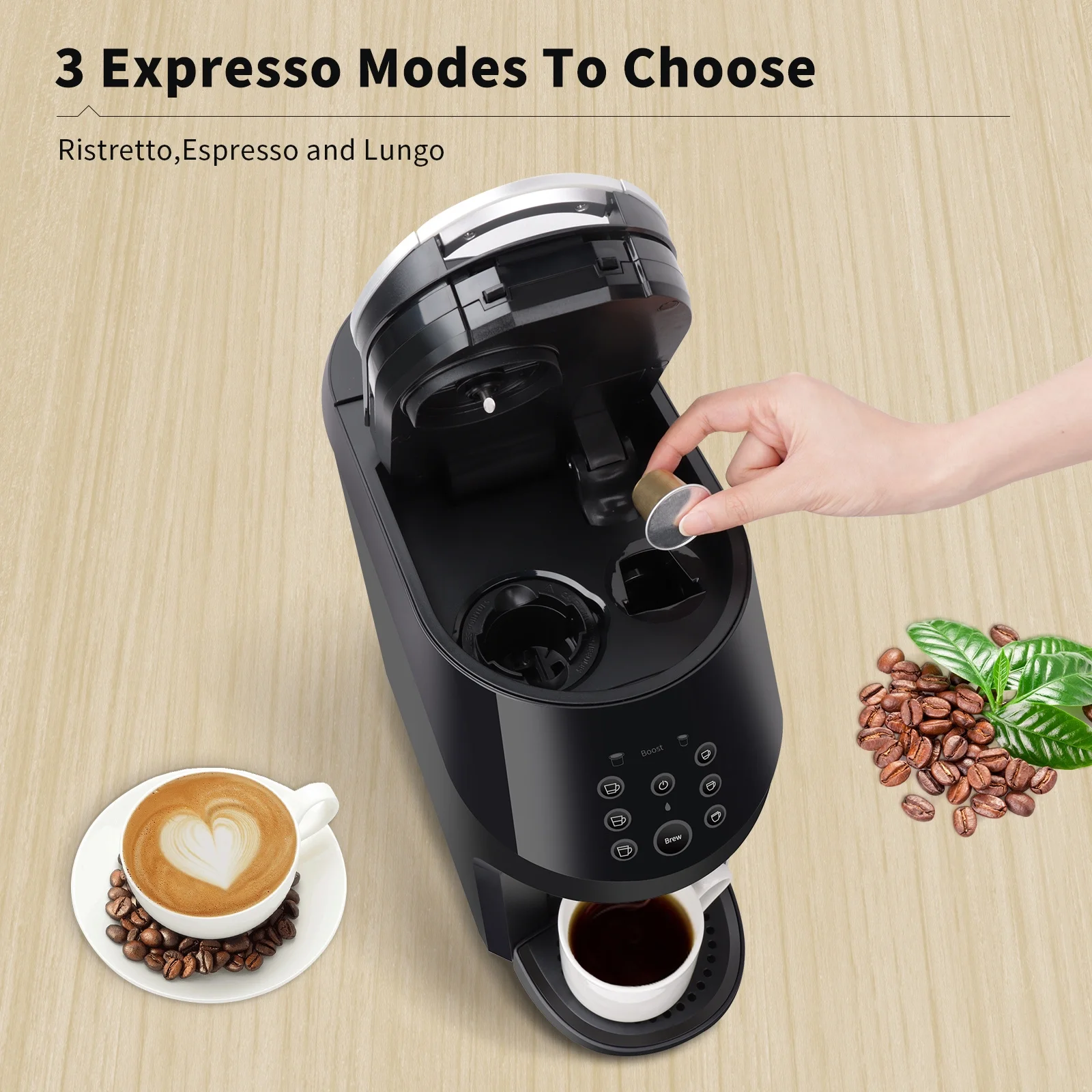 ♨️3-in-1 Multifunctional Coffee Maker:This coffee and espresso machine combo lets you brew coffee 3 different ways, compatible with K-Cups/Nespresso pods, or your own coffee grounds with the reusable capsule. Whether you prefer the convenience of pods or the flexibility of loose grounds, this coffee machine has you covered. ♨️Make Your Favorite Coffee:With its large 57oz water reservoir, the pod coffee maker for K-Cup can brew up more than five cups of coffee at once, making it ideal for busy mornings or entertaining guests. And with 3 different K Cup size options(8, 10, and 12oz), you can customize your coffee to your liking. ♨️Customize Your Coffee Taste:The espresso coffee machine’s 19 bar pressure system delivers professional-grade espresso, with three modes for nespresso pods(Ristretto, Espresso, and Lungo) to choose from. Plus, you can create your favorite cappuccino and latte drinks with ease. ♨️Enjoy a Cup of Coffee in Minute:With its fast brewing time, this coffee brewer lets you enjoy a hot cup of coffee in just one minute. And thanks to the optimal brewing temperature of 185°F, your coffee will taste delicious and flavorful every time. ♨️Easy to Clean and Maintain:This coffee maker features a removable drip tray and water tank for easy cleaning and maintenance. Plus, its cleaning function ensures that your machine stays fresh and clean, with no leftover coffee residue. And with its sleek and modern design, this espresso machines looks great for home. 🍮Why the Nespresso capsules from the 3 in 1 coffee maker do not fall properly into the used capsule container?🍮 1. The top lid of the coffee machine is not fully open, open the top lid properly; 2. The used capsule container is full, you need to empty the used capsule container and then open the top lid to drop the Nespresso capsules. 🍮Why the appliance only dispense clean water and no coffee is dispensed on the Coffee and Espresso Combo Machine?🍮 Select the wrong functional button. For example, the K-CUP capsule is placed but the Nespresso button is pressed.Press the button again to cancel the current function and select the correct functional button. 🍮Why the indicators of “8oz” and “10oz”(The K Cup Size) flash on the coffee machine at the same time?🍮 After the machine has brewed a total of 300 cups of coffee, “8oz” and “10oz” (The K Cup Size) flash rapidly to indicate descaling. Press and hold the “8oz” and “10oz” (The K Cup Size) buttons for 3 seconds to start the descaling mode 🍮Why the indicators of “10oz” and “12oz”(The K Cup Size) flash on the coffee machine at the same time?🍮 This is a high-temperature warning for the coffee maker, at which point stop operating the appliance and the warning will be canceled after the appliance is cooled down. 🍮Why is there water in the tank but the coffee maker’s water shortage reminder keeps flashing?🍮 When there is less than 12oz of water in the tank, there will be a water shortage alarm, at which point you should add water and restart the coffee machine.