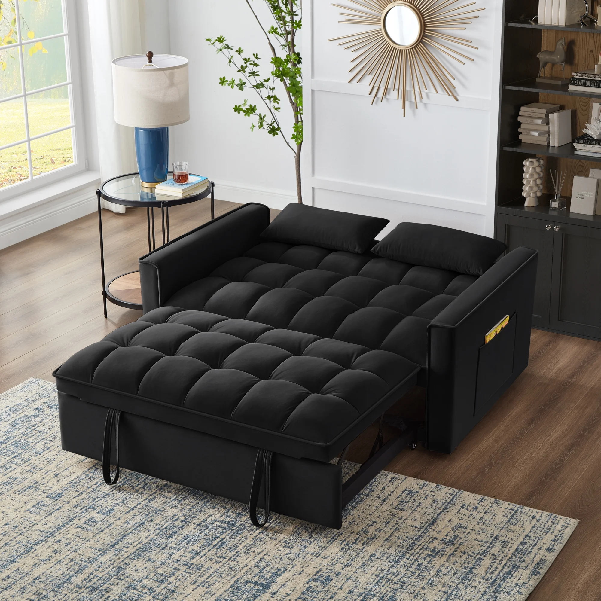 3 in 1 Convertible Sleeper Sofa Bed, 53″ Modern Convertible Sofa Bed with 2 Detachable Arm Pockets,Velvet Pull Out Couch with Pull Out Bed for Living Room Furniture,Black