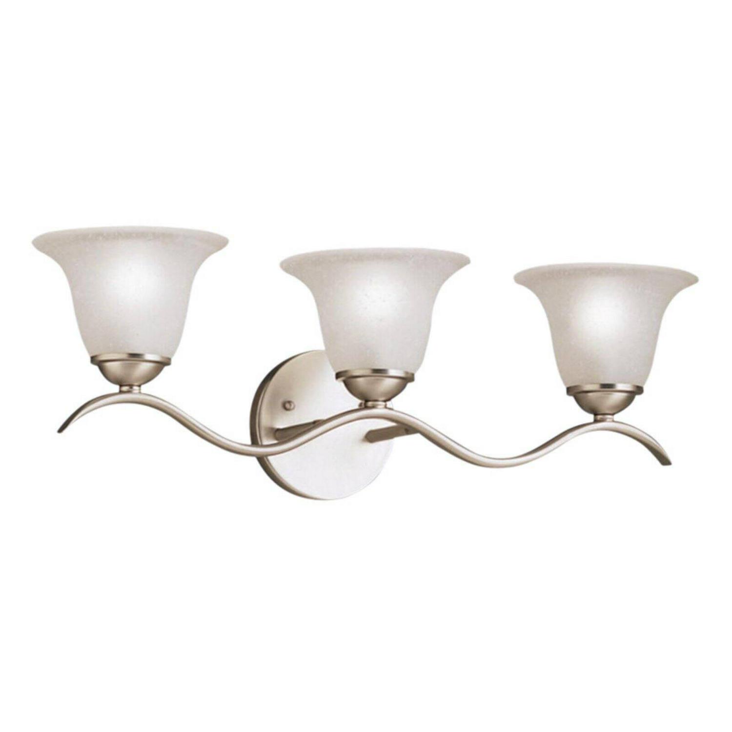Collection: Dover, Material: Steel, Finish Color: Tannery Bronze, Width: 22.5″, Height: 7.75″, Depth: 8″, Height From Outlet Box: 5″, Backplate Width: 5″, Backplate Length: 5″, Lamping Type: Incandescent, Number Of Bulbs: 3, Wattage: 100 Watts, Dimmable: No, Moisture Rating: Damp Rated, Desc: Bathe your bathroom in a wave of light with this unique 3-light Bath bar from Kichler. The fixture’s bar utilizes a fluid design with Brushed Nickel finish and Etched seedy glass covers. Can be installed with the glass up or down, allowing you to customize the look as you see fit. Mounting Direction: Up or Down / Back Plate Height: 5.00 / Back Plate Width: 5.00. ,-Dover – 3 light Bath Strip – with Transitional inspirations – 7.75 inches tall by 22.5 inches wide-Tannery Bronze Finish-Brushed Nickel – Seedy Satin Etched, Dover Vanity Light, Vanity Light, Transitional Vanity Light, Brushed Nickel finish Vanity Light, Damp Rated Vanity Light, vanity light, bathroom light, over sink light, bath bar, multi light wall sconce, vanity-6323TZ