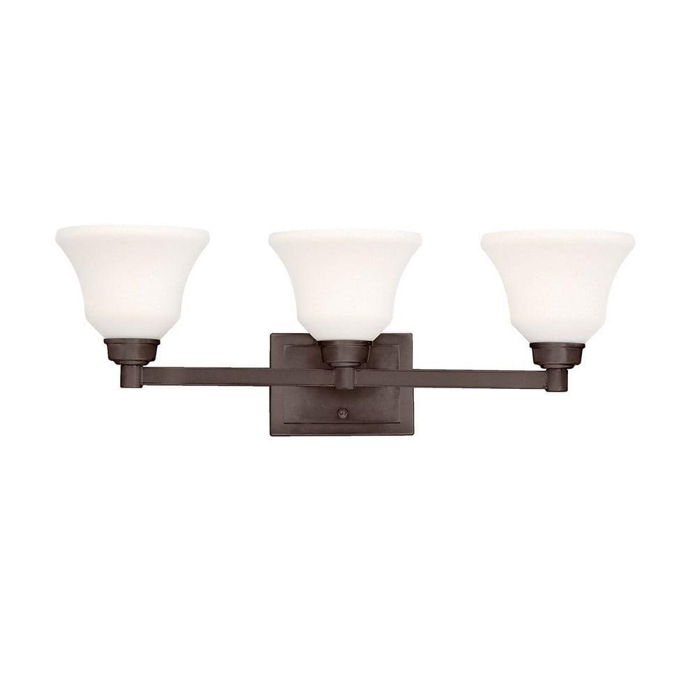 Kichler Lighting-5390OZL18-Collection: Langford, Material: Steel, Finish Color: Olde Bronze, Width: 26.25″, Height: 8.5″, Length: 8.3″, Depth: 8.25″, Height From Outlet Box: 8.5″, Backplate Width: 8.5″, Backplate Length: 4.6″, Lamping Type: LED, Number Of Bulbs: 3, Wattage: 100 Watts, Moisture Rating: Damp Rated, Desc: With clean, flowing lines that embrace simple and graceful contemporary style, the Langford Collection is perfect for the homeowner looking for a new interpretation of classic design. The Brushed Nickel finish accentuates the Langford design with crisp appeal, allowing it to work with almost any decor. Langford fixtures provide a fresh ambiance to a room with the assistance of Etched white glass, providing an earthy comfort that blends well with more traditional interiors. The 3-light bath sconce measures 26 in. wide with an 8in. body height, making it the ideal size for any bath. A 100-watt (max.) bulb is used, while the glass can be installed either up or down. The Langford wall sconce is UL listed for damp location. Mounting Direction: Up or Down / Back Plate Height: 4.60 / Back Plate Width: 8.50. ,-Langford – 3 Light Bath Vanity Approved for Damp Locations – with Transitional inspirations – 8.5 inches tall by 26.25 inches wide-Olde Bronze Finish-LED Lamping Type