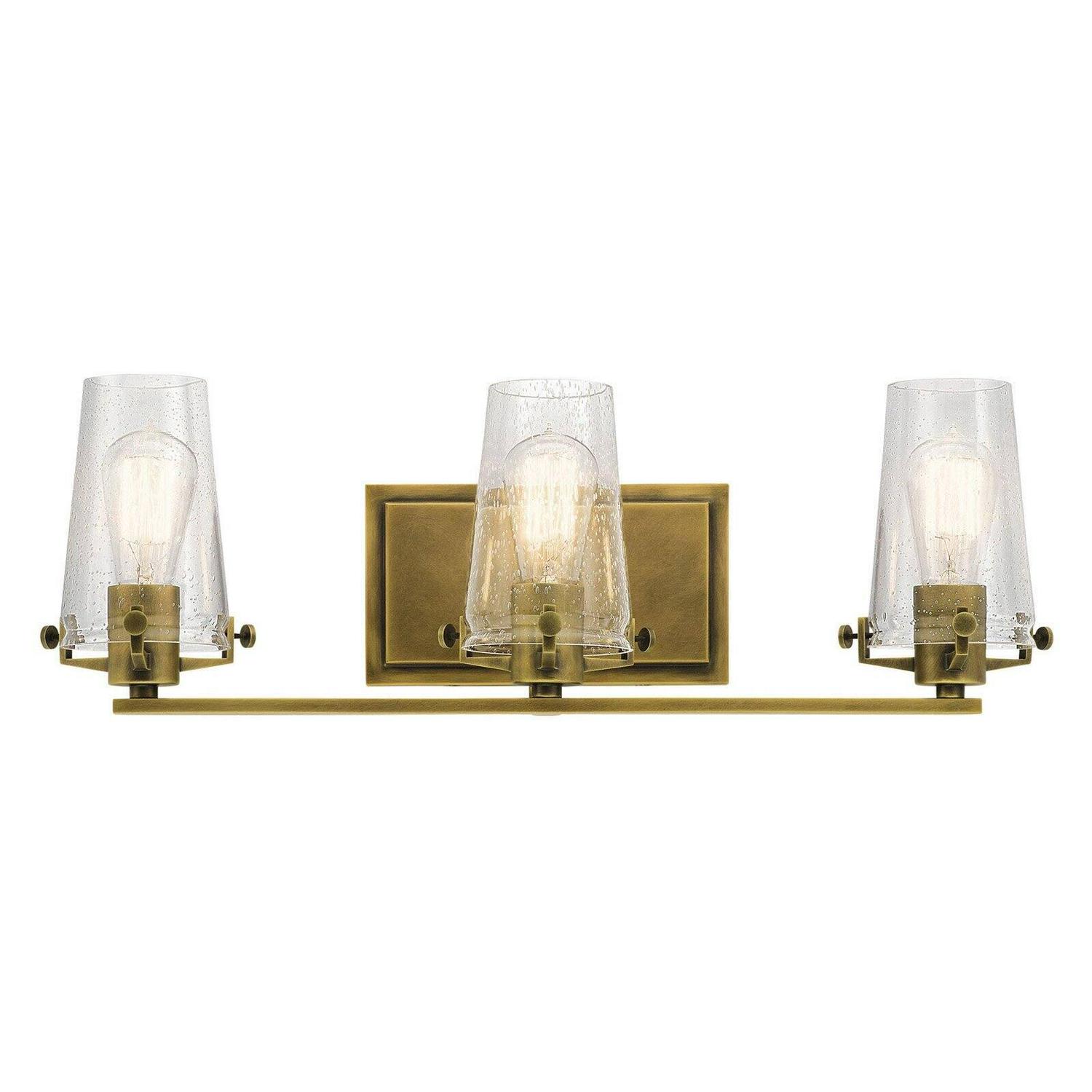 Kichler Lighting-45297NBR-Collection: Alton, Material: Steel, Finish Color: Natural Brass, Width: 24″, Height: 8″, Depth: 7.5″, Height From Outlet Box: 3.5″, Backplate Width: 9″, Backplate Length: 5″, Lamping Type: Incandescent, Number Of Bulbs: 3, Wattage: 100 Watts, Moisture Rating: Damp Rated, Desc: This Alton 3 light bath light in Natural Brass combines industrial-era detailing and soft modern style. While it’s “nuts & bolt” hardware accents create a look that works in both traditional or modern baths.,-Alton – 3 Light Bath Vanity In Vintage Industrial Style-8 Inches Tall and 24 Inches Wide