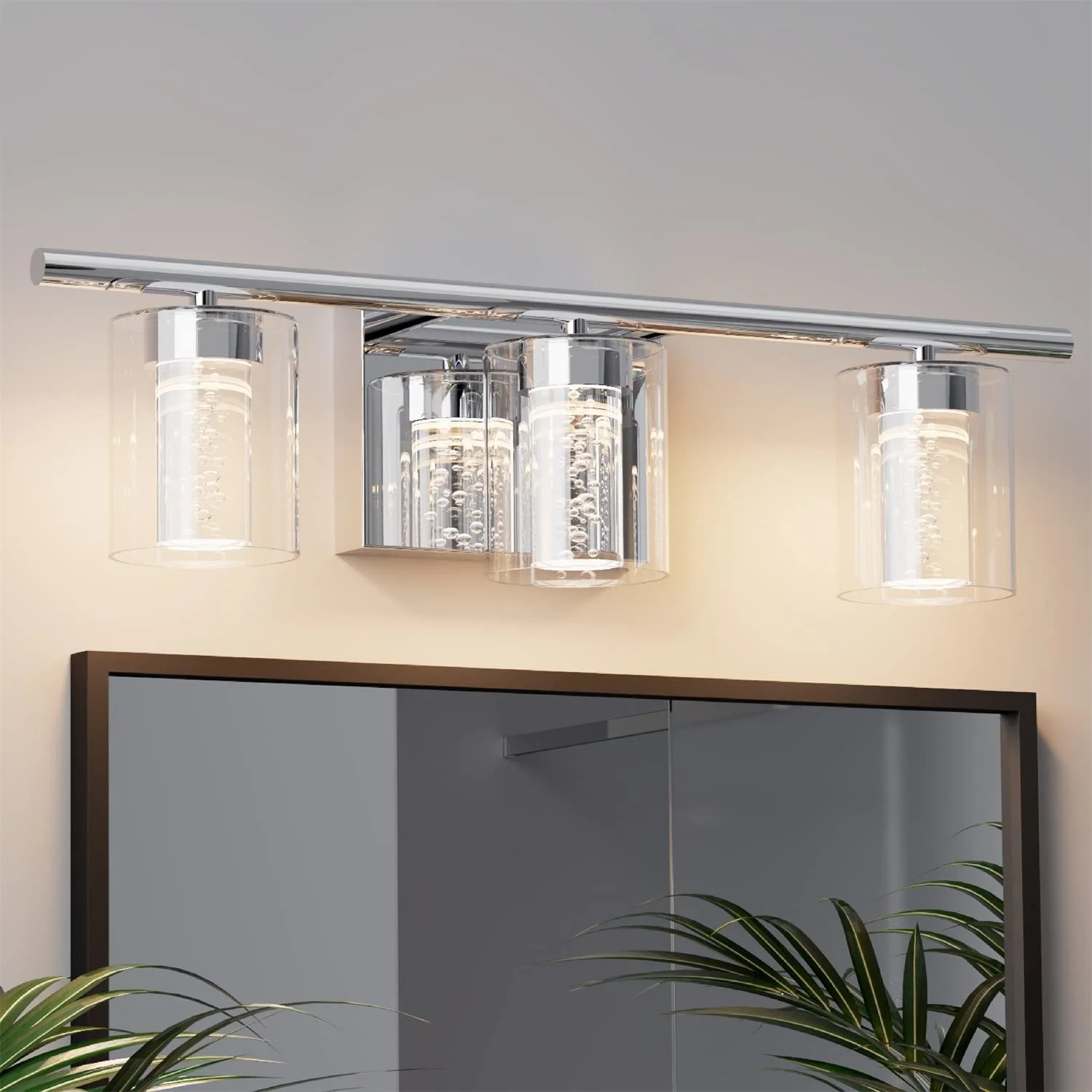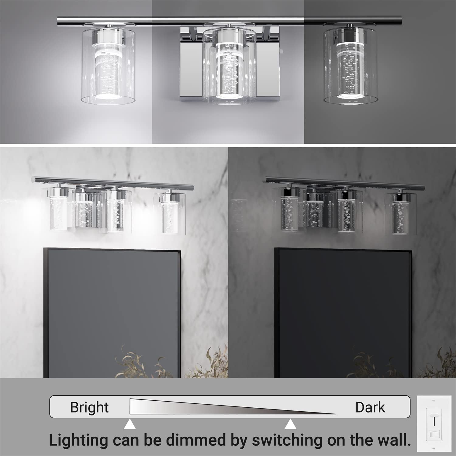 [Crystal Bubble Design]- This 3-light bathroom vanity light adopts crystal glass technology, the imitation crystal bubbles are frozen in ice, perfectly dispersing the light from the integrated LED bulbs, providing you with warm and pleasant light, like forming a romantic bubble starry sky Surrounding you, bringing you a unique visual experience. [3 Color LED & Energy Saving]- 21W led vanity light for bathroom, our bathroom vanity light, no bulb required, A+ energy efficiency rating, save you 80% energy cost. The perfect alternative to traditional light bulbs. There are three light color options of cool white/natural white/warm white to meet your needs for warm light and cool light. [High Quality & Dimmable]- This chrome bathroom light fixtures is made of thick glass shade and strong alloy metal, anti-oxidation and fading, can be used in wet places, don’t worry about splashing water. Plus, it’s dimmable when used with a dimmer switch. NOTE: Dimmer switch not included. [Easy Installation]- All mounting hardware required for installation are included in the package. Just need to follow the illustrated instructions provided for assembly and installation! [Application]- Ideal as a bathroom light, bathroom mirror light, vanity lights for bathroom. This chrome vanity light also allows you to mount it in an upward or downward position, depending on your preference. [After-sales service]- If you have any questions about the installation and quality, please log in to your account, check the order ID and click “Contact Seller” to contact us. our customer service will solve your problem within 24 hours, We will try our best to improve your shopping experience.