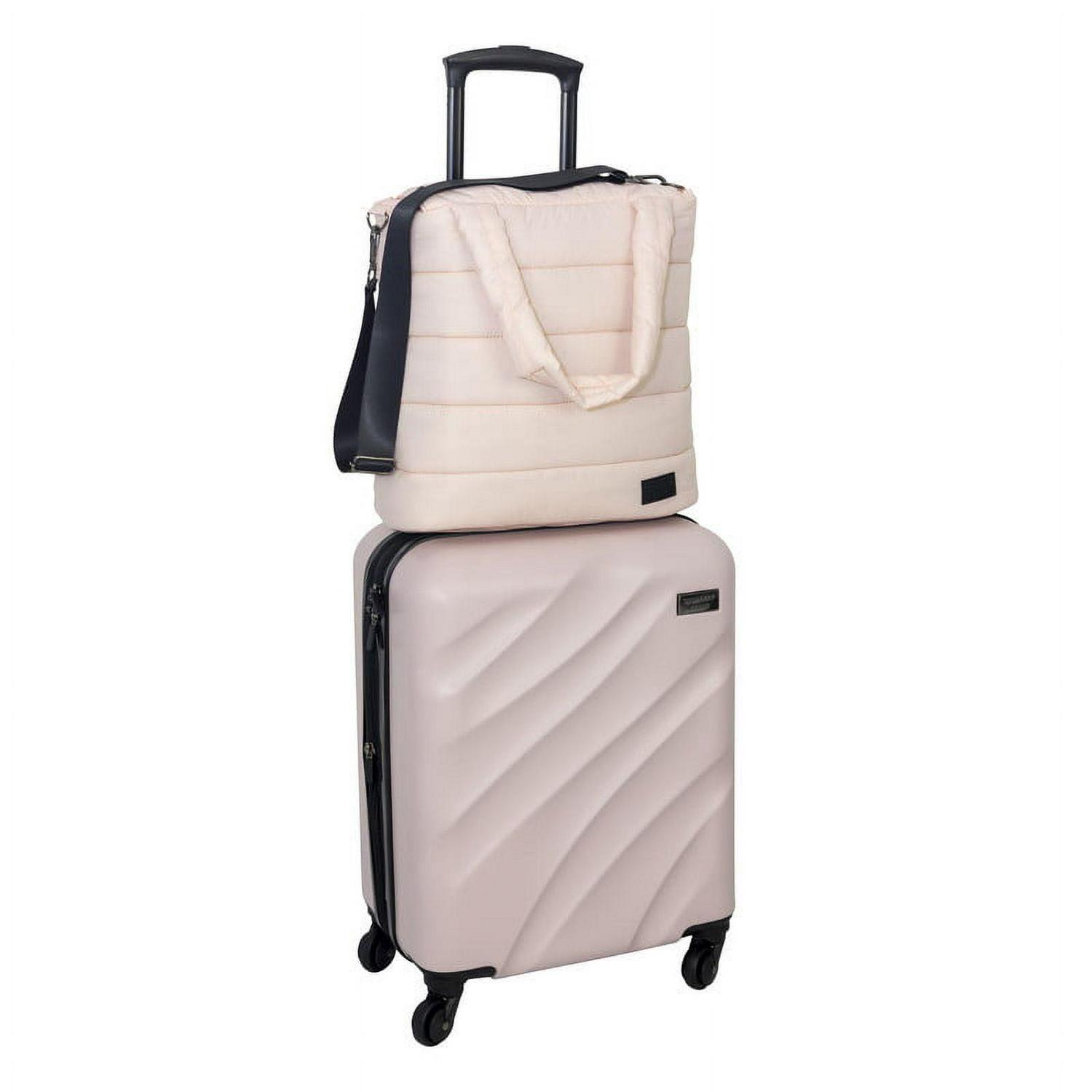 This is a fabulous new 2 pc luggage set consisting of a 20 hardside expandable vertical and a 15 puffy quilted carry-all. The hardside vertical is crafted in rugged ABS plastic and has fully lined interior. It features 360 spinner wheels and has a push button telescopic handle system. The set also includes a carry-all that is made of puffy quilted polyester. It features an adjustable/removable shoulder strap and padded handle. This is a must have travel set!