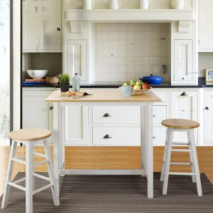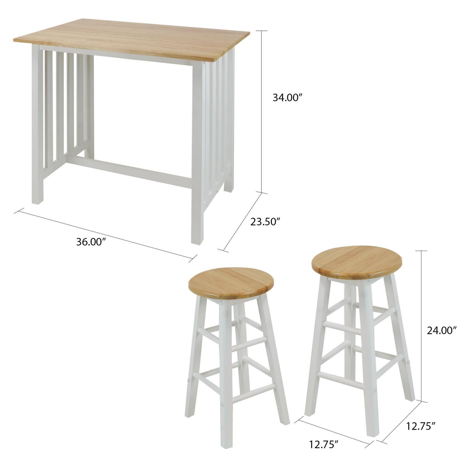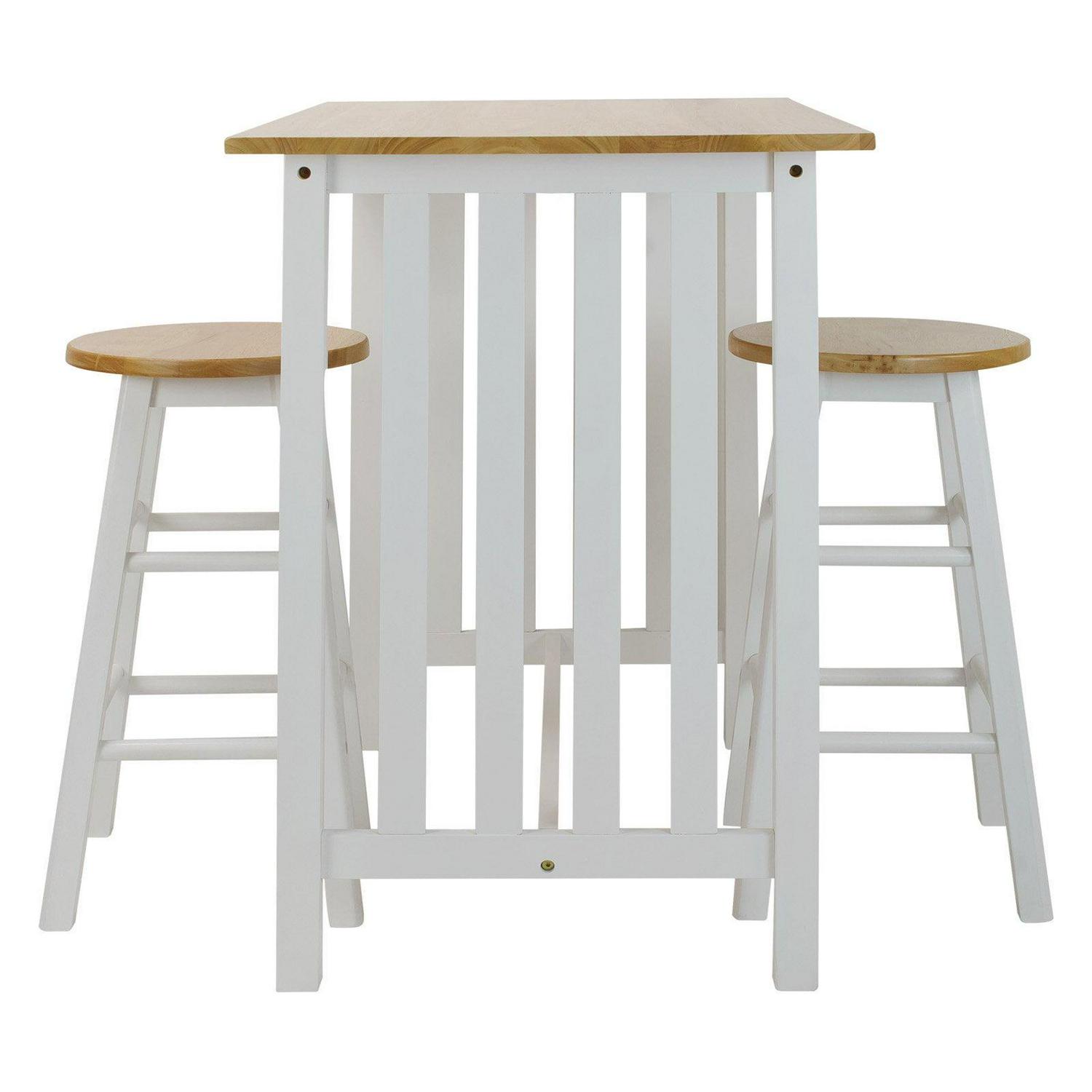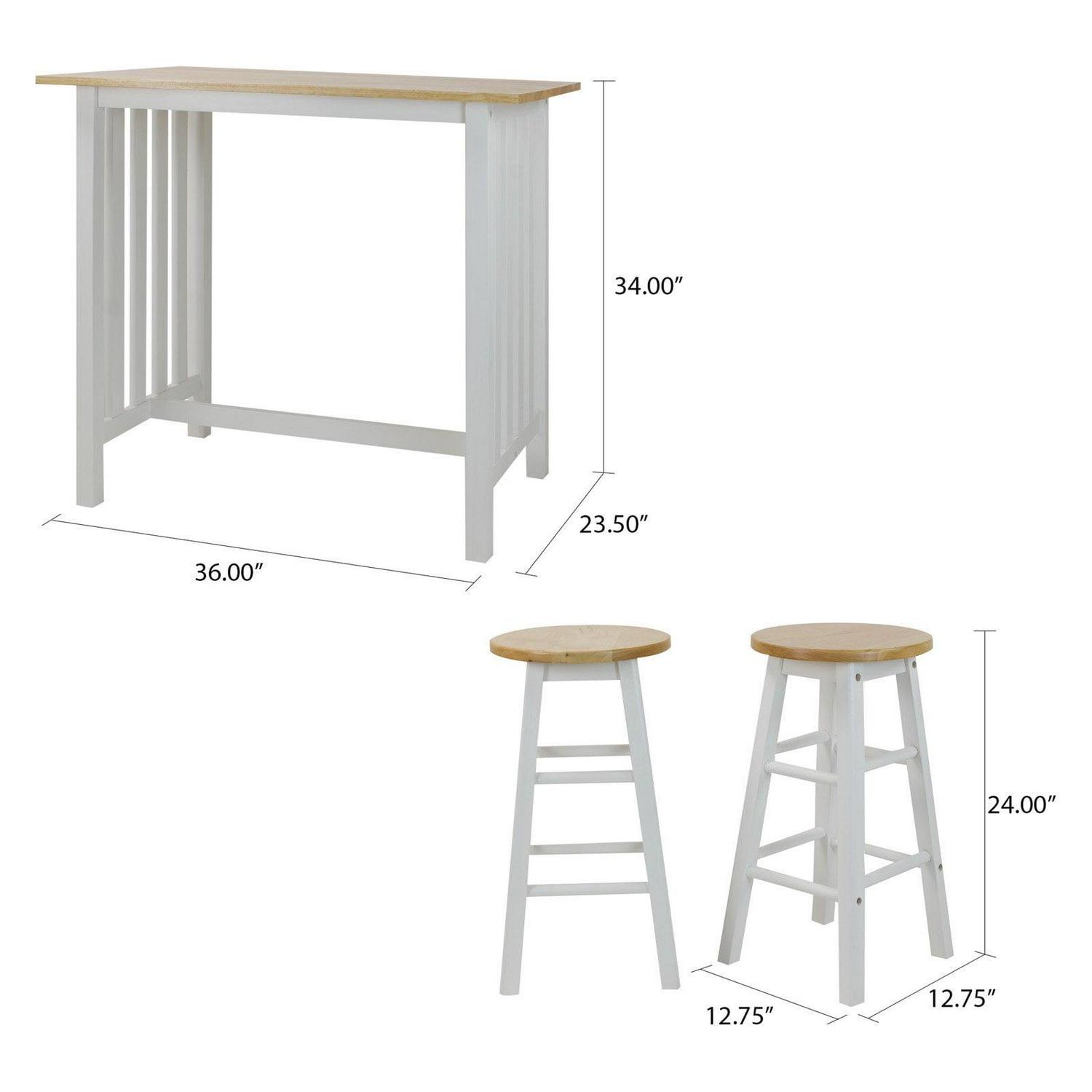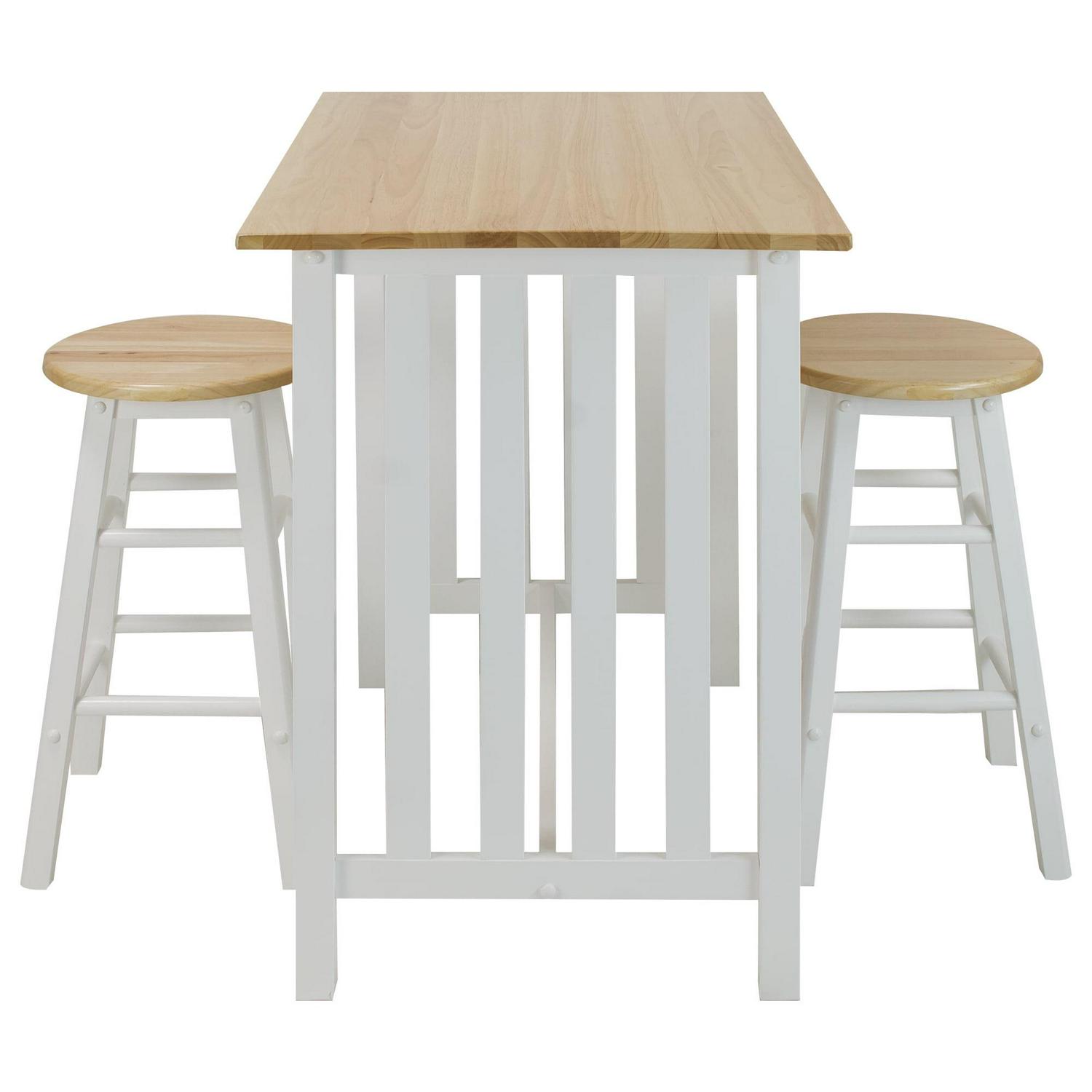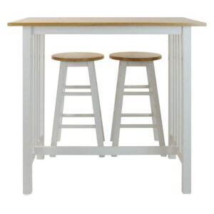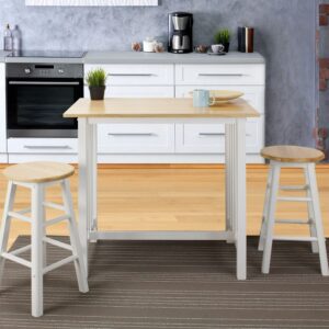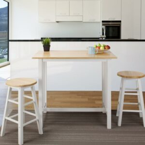 The 3-Piece Solid Wood Pub-Style Breakfast Cart Set is perfect your apartment, smaller kitchen, or breakfast nook. The counter-height table and classic stools create a cozy spot to have your morning coffee or share an intimate candlelit meal. Mission style by design, it elicits an understated balance that is sure to blend. The set comes with one pub table, two stools, and a beautiful two-tone white and natural wood finish to match the decor of your home flawlessly. Eat your food in style with the 3-Piece Pub-Style Breakfast Cart Set by Casual Home.