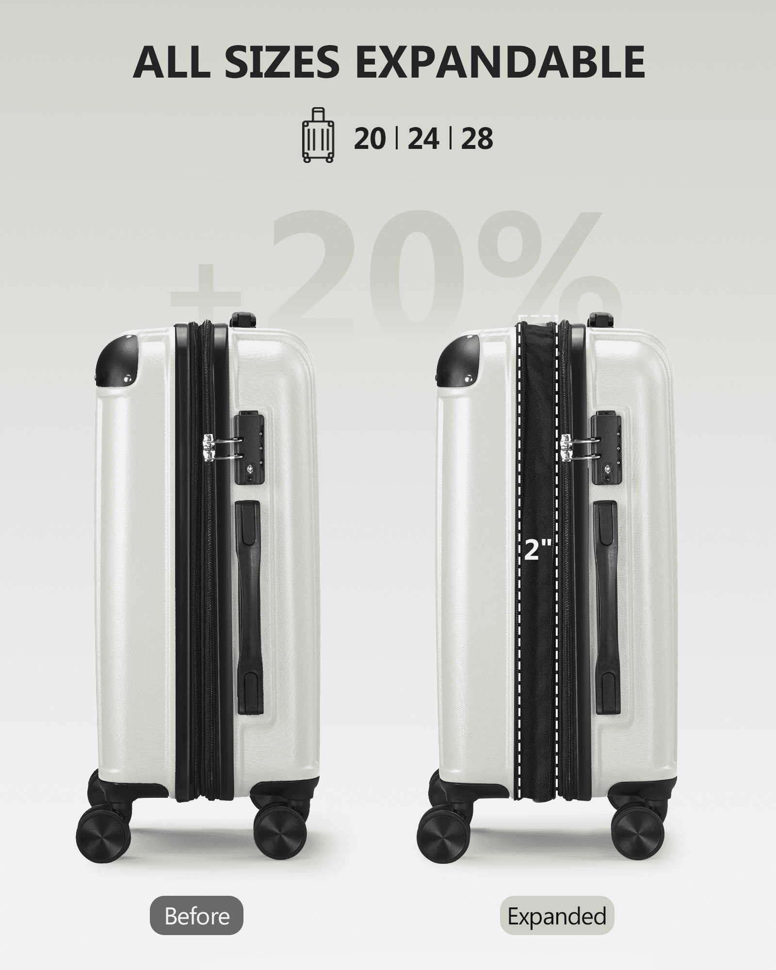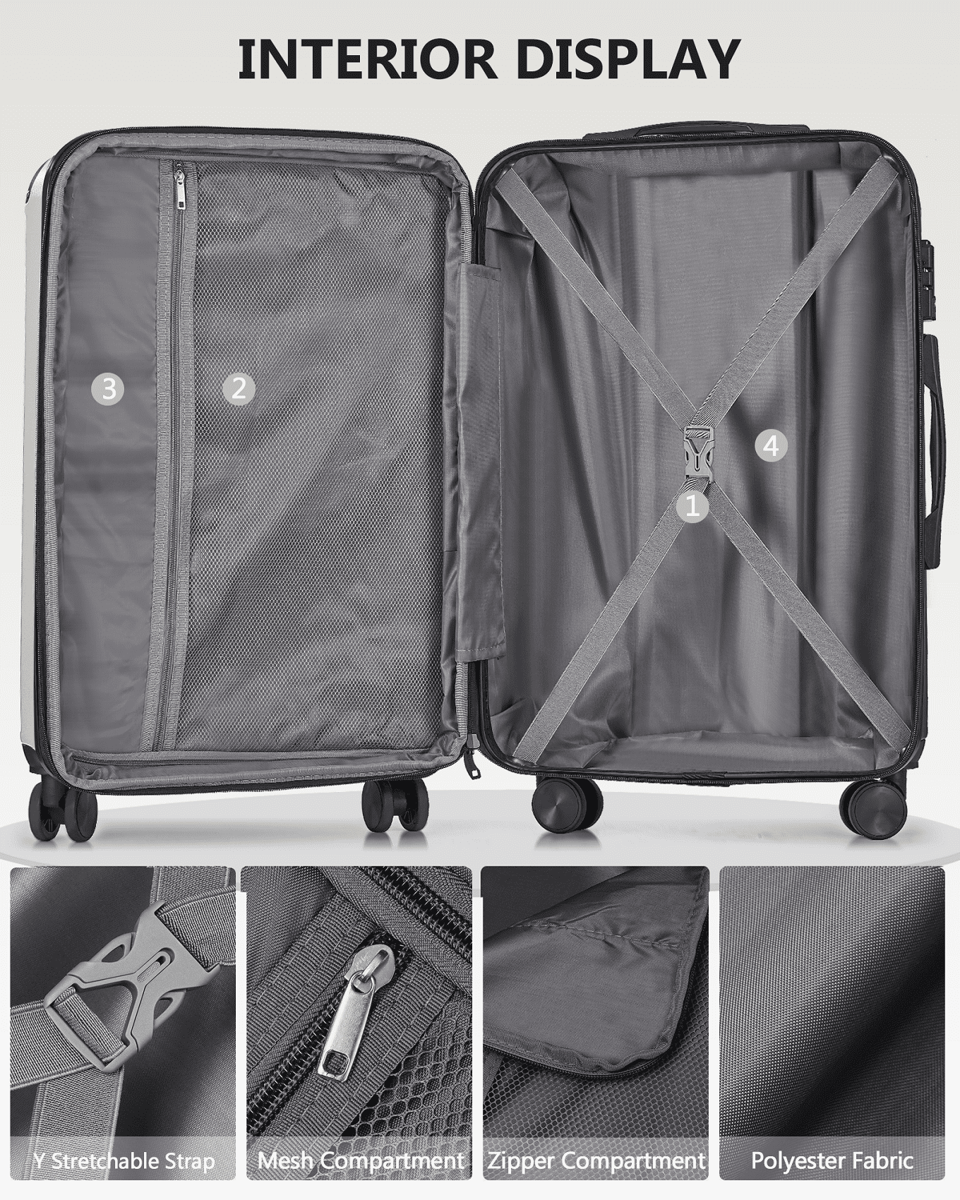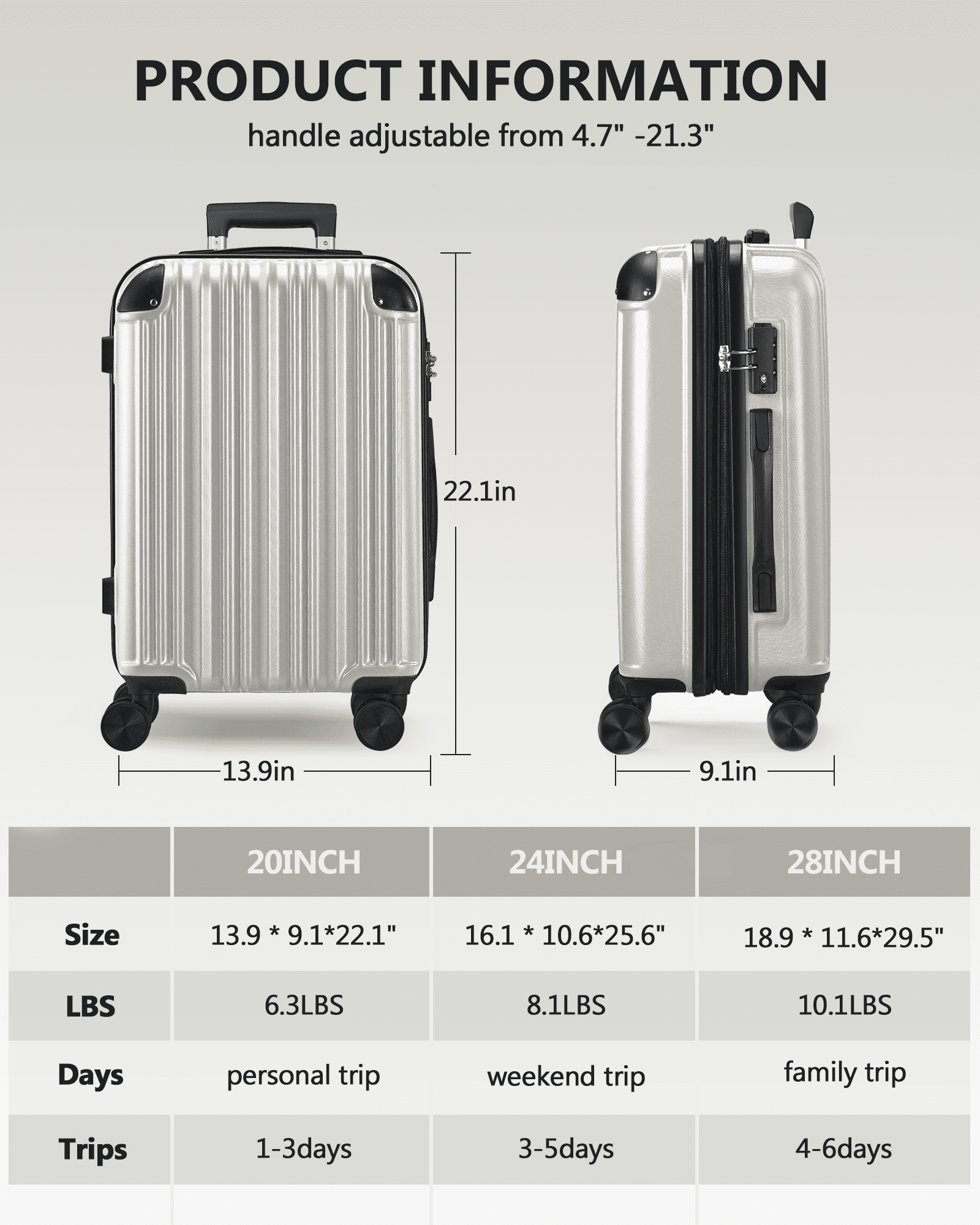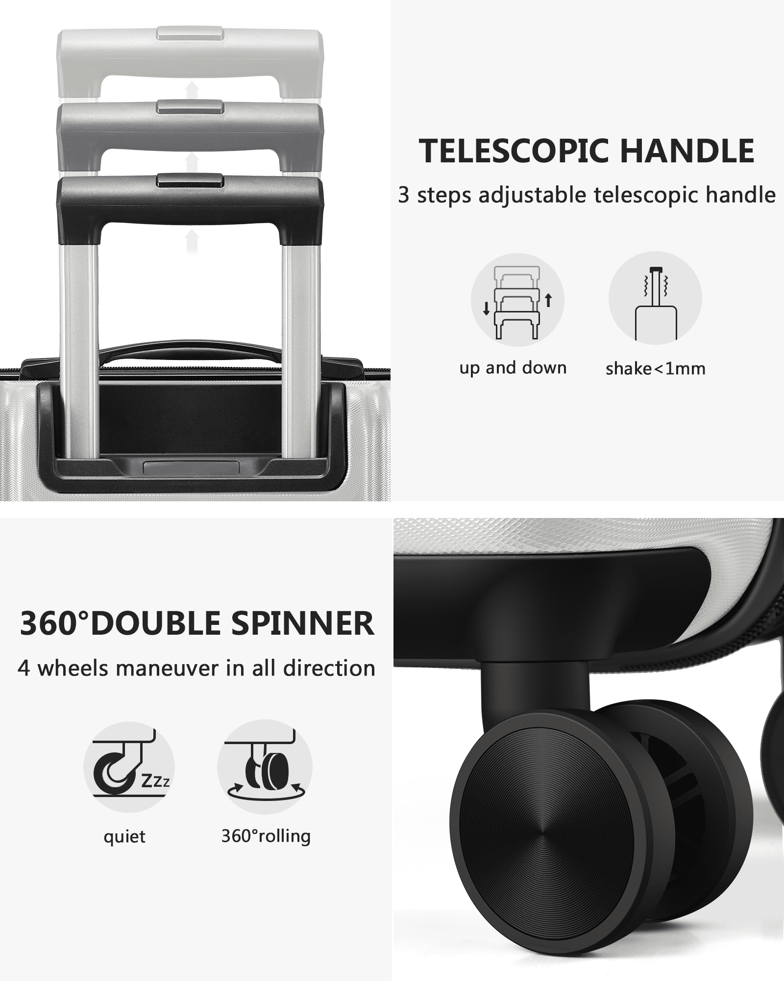 3 DIFFERENT SIZE: the luggage set of 3 includes a 28″ large checked suitcase, a 24″ medium checked suitcase and a small 20″ carry on suitcase with size approved for international travel. The suitcase set is perfect for any trip. EXPANDABLE DESIGN: the luggage set 3 piece are expandable, a pull of the expansion zipper provides extra space for packing and souvenirs, allowing you to pack more items and keep clothing neatly pressed. Top and Side handle makes it easier to carry your luggage when passing the stairs. DURABLE MATERIAL: the extra-thick ABS hard shell is durable and lightweight, resists stains and waterproof, keeping the luggage beautiful after long usage. Spacious Interior is equipped with a mesh pocket and an X strap to provide better protection for items during use. TSA LOCK & ADJUSTABLE HANDLE: the TSA compliant lock can protect your valuables with security and peace of mind, which is approved by the Transportation Security Administration. Sturdy telescoping handle adjusts to multiple heights for comfort, its button design makes it depress perfectly. MULTI-DIRECTIONAL SPINNER WHEELS: the 360 wheels spin freely and allow the suitcase to glide over the airport floor even with a heavy load, ensuring smooth and easy movement in any direction.