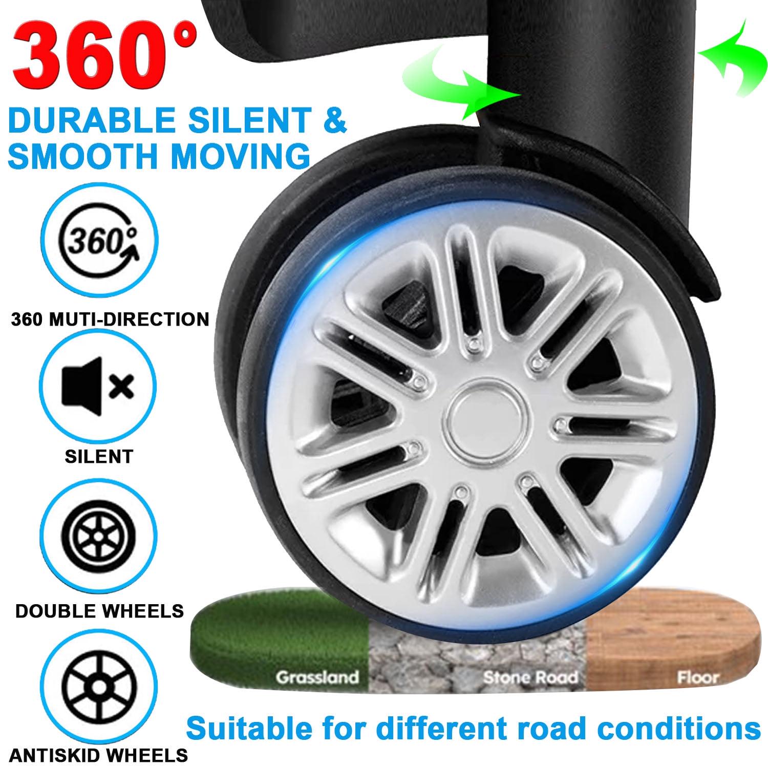 – [Upgrade Double Wheels] : Benefit from brand new PP and lubricating balls inside wheels, luggage moves very silent and smoothly with 360° rotate double wheels. ( A professional luggage quality test: Luggage can loads 16kg and walks 45km at a speed of 10km/h ).