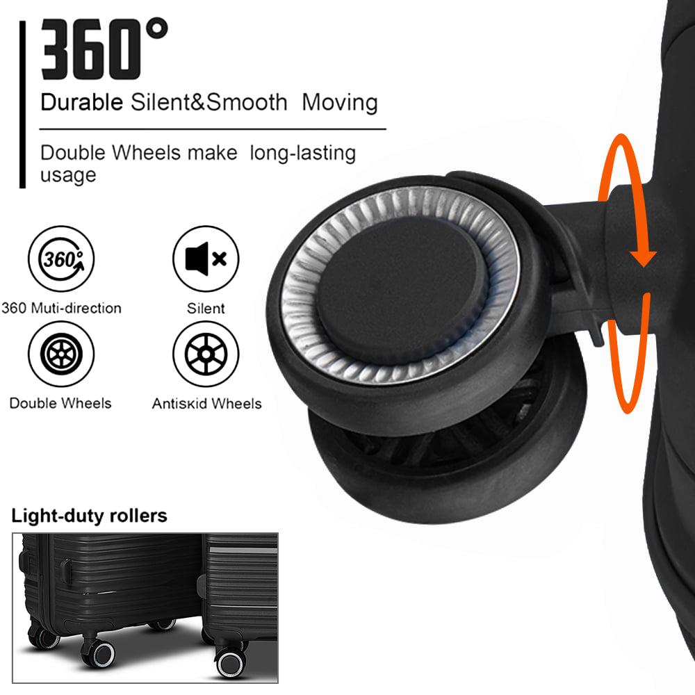 – [Upgrade Double Wheels] : Benefit from brand new PP and lubricating balls inside wheels, luggage moves very silent and smoothly with 360° rotate double wheels. ( A professional luggage quality test: Luggage can loads 16kg and walks 45km at a speed of 10km/h ).