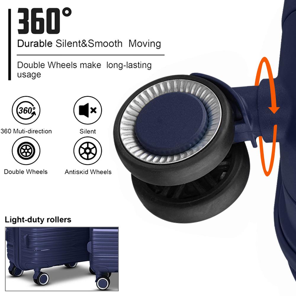 – [Upgrade Double Wheels] : Benefit from brand new PP and lubricating balls inside wheels, luggage moves very silent and smoothly with 360° rotate double wheels. ( A professional luggage quality test: Luggage can loads 16kg and walks 45km at a speed of 10km/h ).