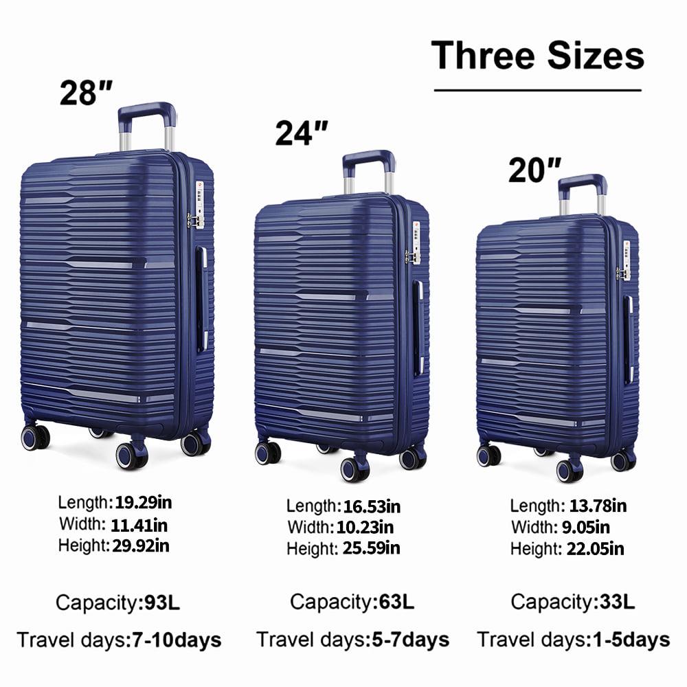 – Luggage Size : 20 Inch : 13.78*9.05*22.05 inches 24 Inch : 16.53*10.23*25.59 inches 28 Inch : 19.29*11.41*29.92 inches Capacity : 20 Inch : 43L 24 Inch : 72L 28 Inch : 105L Luggage Weight : 20 Inch : 6lbs 24 Inch : 8lbs 28 Inch : 10lbs Travel days : 20 Inch : 1~4days 24 Inch : 4~7days 28 Inch : 7~10days