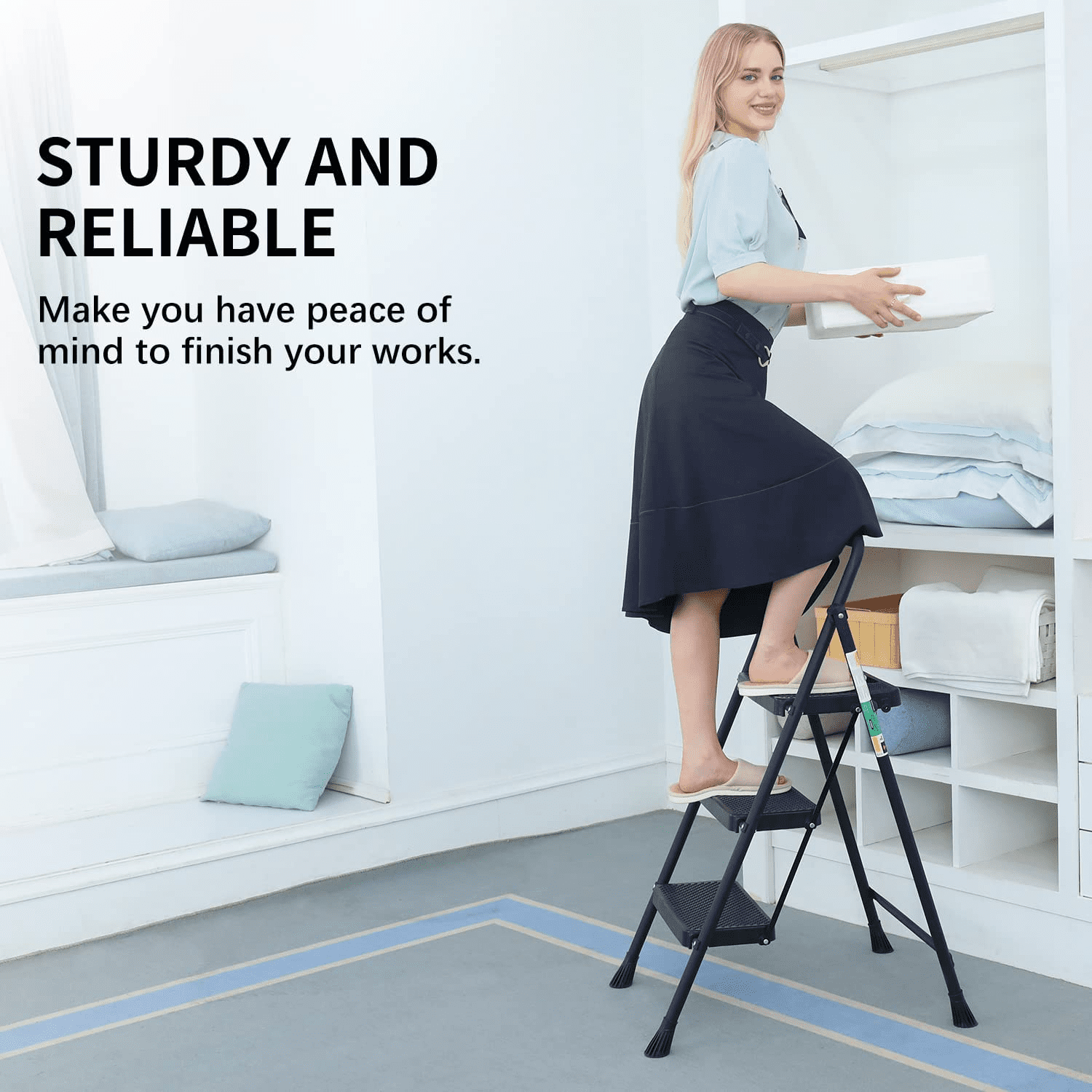 With a sturdy construction, the step ladder offer the user a sense of stability. Metal safe buckle on the back will locked in place when you use the 3 step ladder. Comfortable handgrip increase the safety and convenience. All of this guarantee the safety and convenience during climbing and handling.