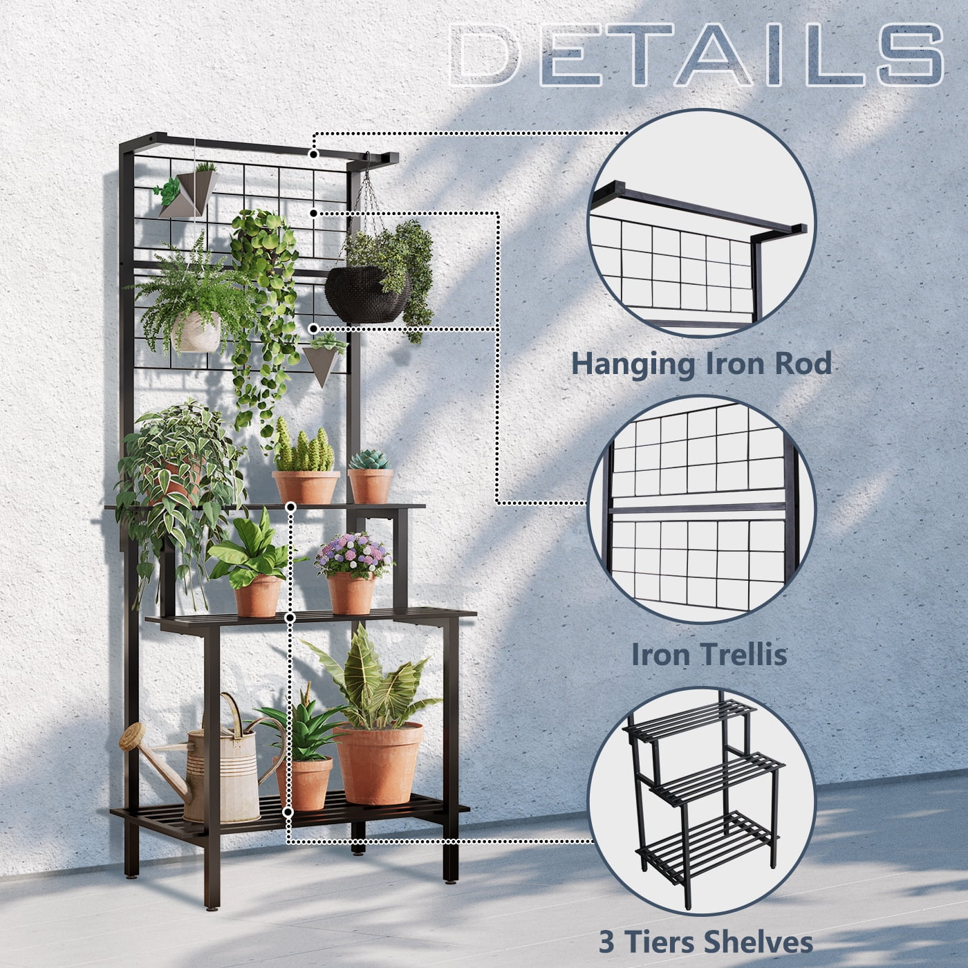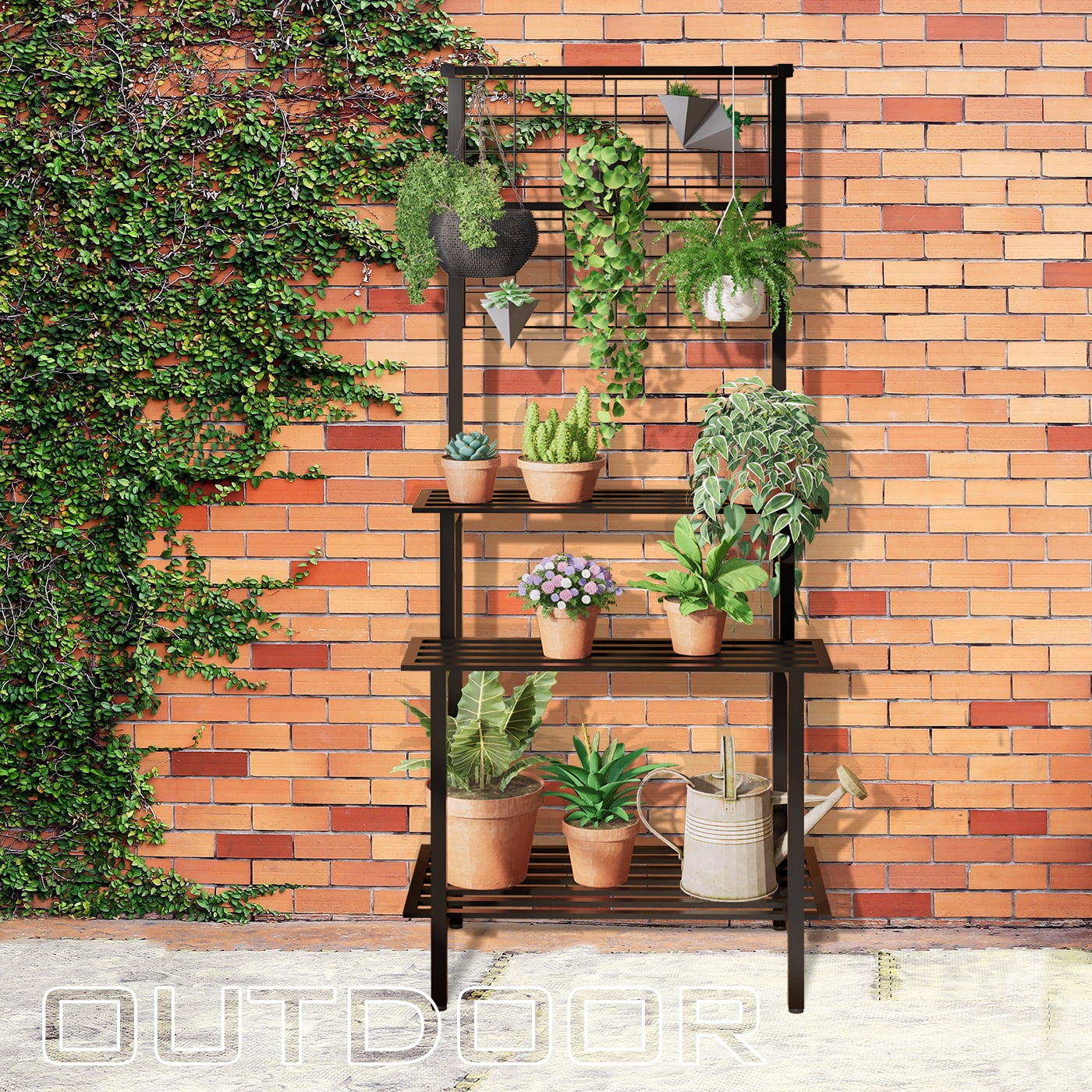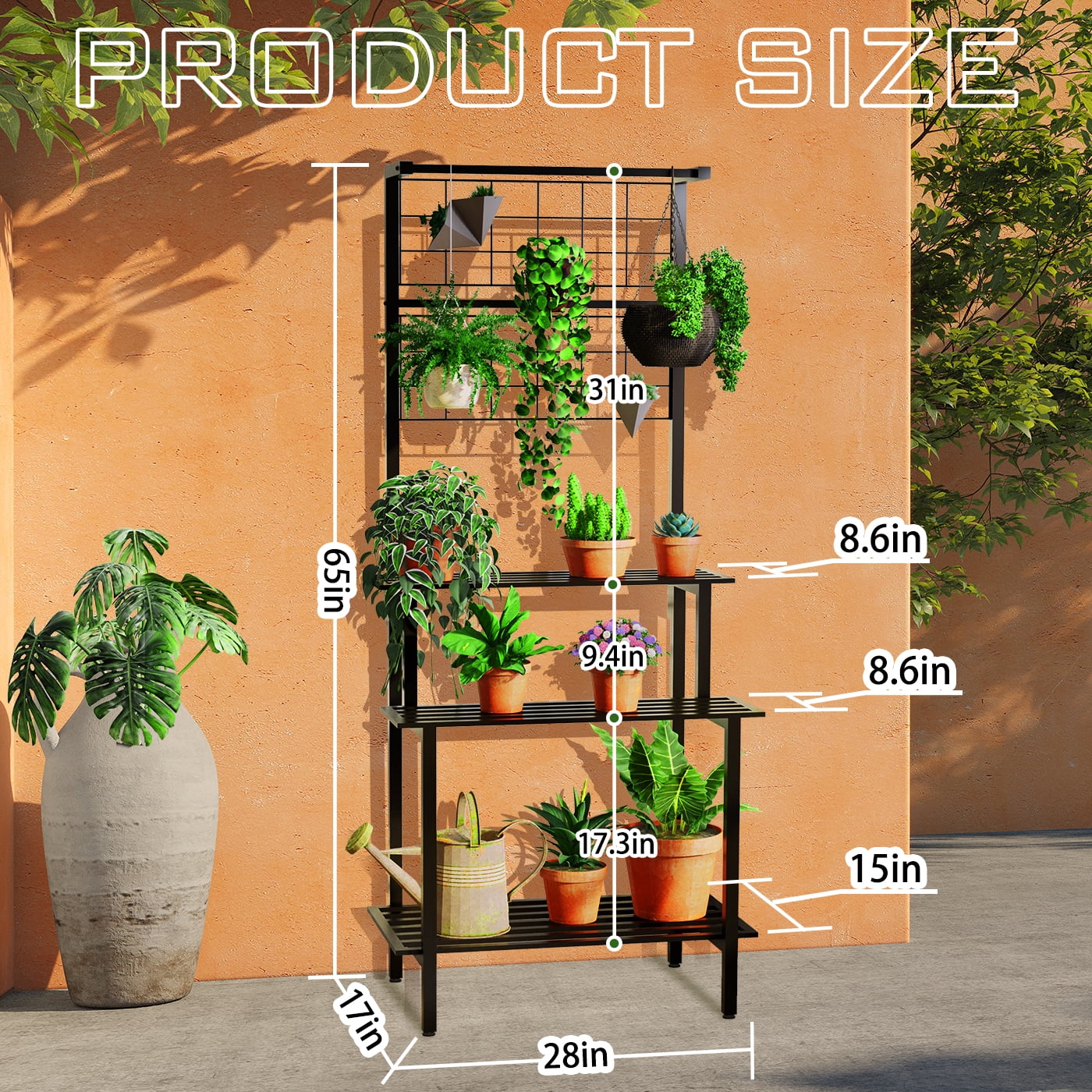 ãPlenty Storage SpaceãThe YuAnWe plant stand indoor features three main parts. The 3-tier tall plant stand at the bottom are for holding your large and heavy plants; 2 grid panels in the middle are suitable for hanging plant pots and succulents; practical sturdy plants display shelf design with hanging iron rod to provide absolute protection for your favorite plants. Great place to display, helping plants get more sunlight and grow better without blocking each other. ãStrudy Structure&Eco-Friendly ãThe metal plant stand is made of high-quality powder-coated iron material, which is durable. Compared with the traditional wooden plant stand, our palnt stand outdoor is environmentally friendly and does not damage the forest. And It is safer and more stable, ensuring strong load-bearing capacity. ãMultifunctional ApplicationãThis minimalist stair style design plant stand is not only used to hold potted plants but also a great addition to decorations. It could be used as a bookshelf, craft display, storage rack, clothes rack, etc. The plant shelf indoor is perfect for your bedroom, living room, balcony, corridor, garden, office, or anywhere else you would like to display. ãEasy to EssembleãThis hanging plant stand comes with clear easy straightforward instructions and installation tools, including all parts and hardware, additional tools are no required. You could quickly assemble and enjoy the fun of installing. ãProfessional ServiceãWe focus on customer using experience and try our best to provide the best product and service for our customers, if you have any question about this multifunctiona plant shelf, just feel free to contact us and we will be always here for you. Superior Iron Material,â Strong Loading Capacity,â Eco-friendly, Formaldehyde-free,and Anti-mold,â Stablilty and Safe