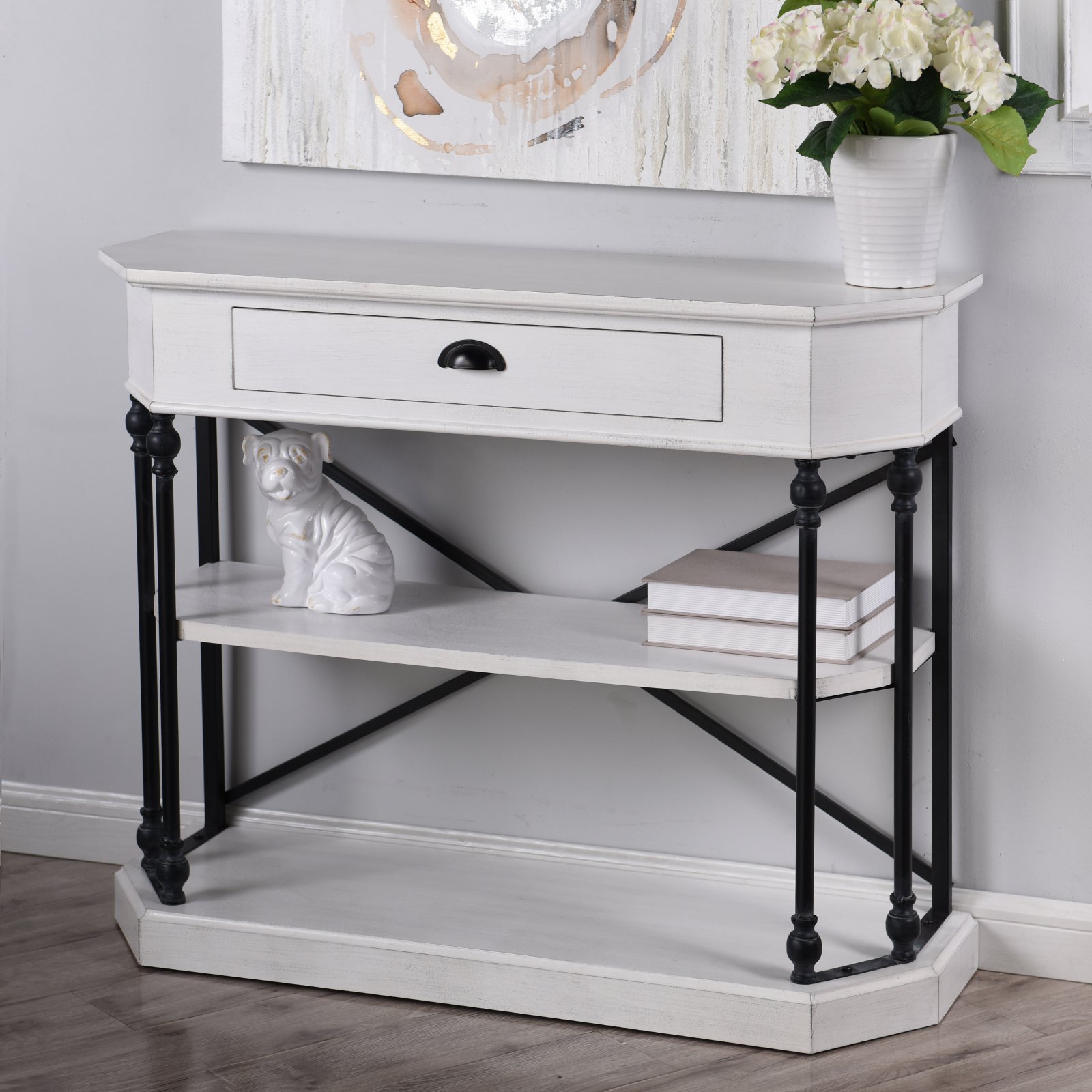This three tier single drawer console table is a sophisticated favorite for the contemporary home. Designed with a hefty base and clipped corner profile, this table features a semi-circular black pull on its drawer. By pairing white finish wood and black legs, it’s an interior designer’s finishing touch in a living room or hallway.