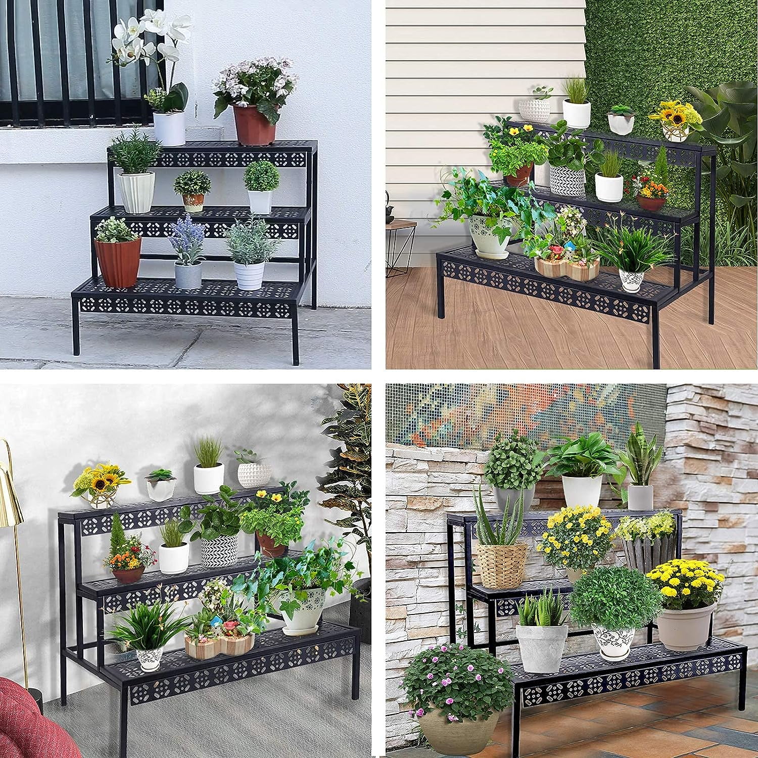 3 Tier Stair Style Metal Plant Stand, Garden Shelf for Large Flower Pot Display Rack Indoor Outdoor, Black