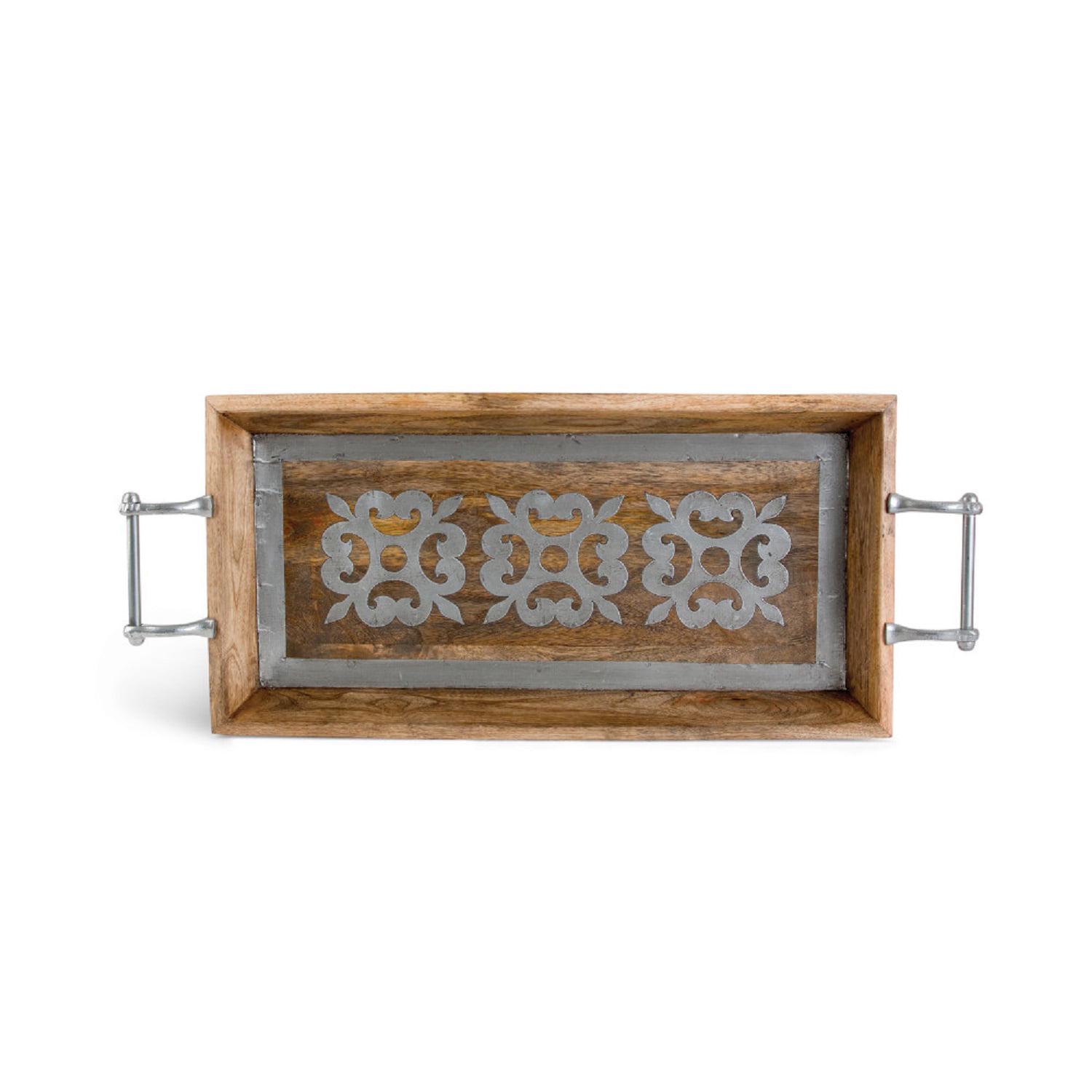 This rectangular wood serving tray is hand-carved and constructed with precision and style. Versatile size and easy grip metal handles allows you to move this tray from room to room carrying coffee to guests or to sit holding hand towels in a guest room. This tray is made from high quality mango wood for durability and long use life, and inlaid with custom aluminum metal. Country cottage or formal, this delightful everyday necessity will be an artful addition to your home.