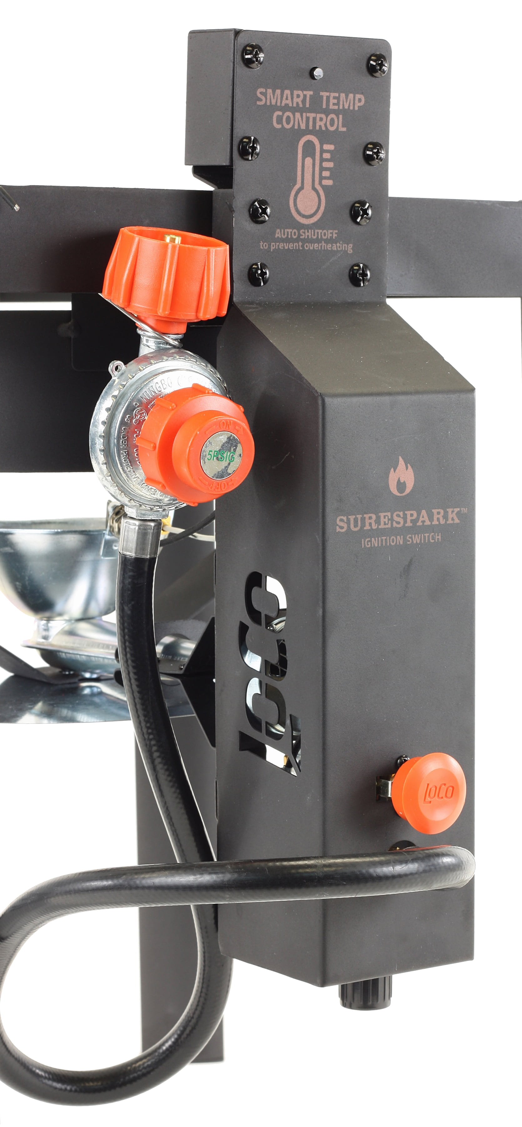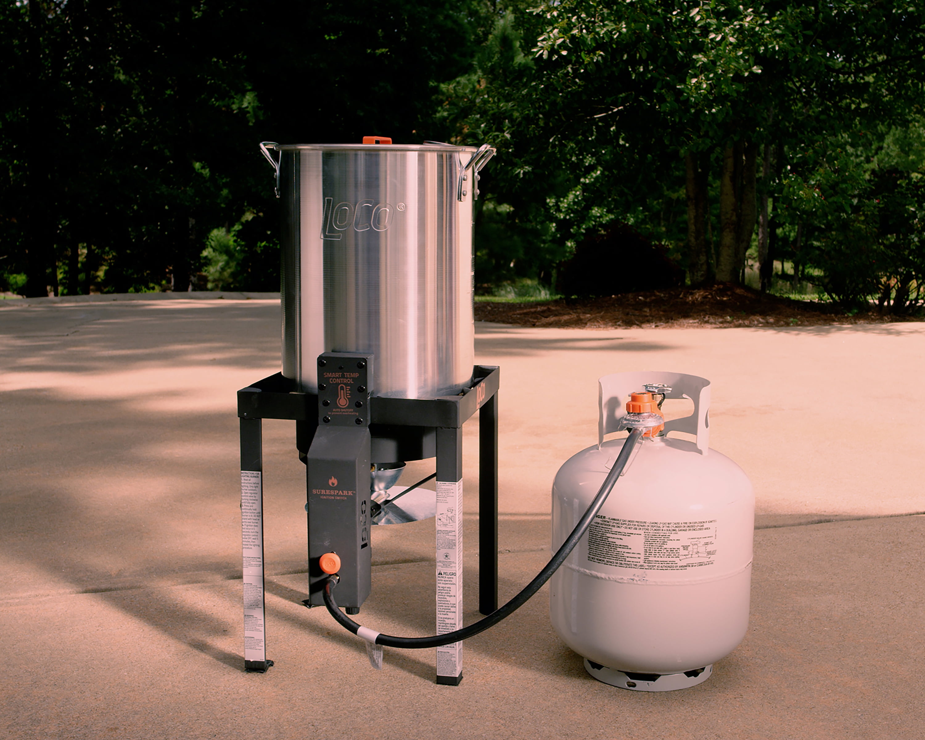 The Loco Cookers 30qt Sure Spark Turkey Fryer including basket is everything you need to prepare a delicious fried turkey and in only 3.5 minutes per pound of turkey (56 minutes for a 16lb turkey)! Heavy-gauge aluminum pot cooks turkeys up to 22 lbs. Sure Spark™ Electronic Ignition is a Game Changer. Lighting your fryer only requires a push of a button…no more matches and lighters. SmartStamp technology monitors oil temperature and prevents overheating without having to reset a timer every 15 minutes. Patent-pending Twist & Drain™ technology provides Easy Hands-Free draining.