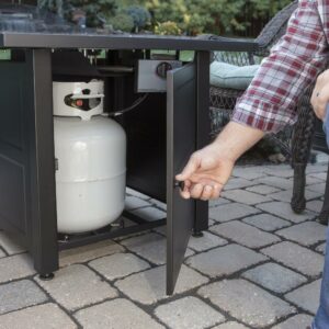 Produce a welcoming ambiance and comforting warmth on cold nights with this Fire Table. With a steel slat mantel, this handcrafted unit features the classic elements of high-end furniture with the durability of weather-resistant metal construction. Its decorative base cleverly conceals a propane tank (not included) and a control panel for adjusting the flame, making this LP gas fire pit an attractive centerpiece for your patio or other outdoor living space. A built-in ignition allows for quick and simple start-ups. Complete with a 30,000 BTU stainless steel burner, you can enjoy all the heat of a classic fire without the mess of tending ashes. It’s available with colored fire glass that accents its flames for an added touch of elegance. Round feet at every corner provide stability and balance. The Blue Rhino Endless Summer fire pit is easy to assemble with no tools needed.