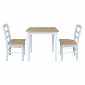 The International Concepts Silerton 3 Piece Dining Table Set with 2 Ladder Back Chairs adds an inviting charm and timeless appeal to any setting. This lovely three piece set in your choice of finish is crafted from solid wood for long-lasting durability. Its table features shaker-inspired legs and a butcher block surface spacious enough for two and, best of all, it comes with the chairs to back up that claim. The two included Madrid chairs share the same ladder back design and possess contoured wood seating for improved comfort.