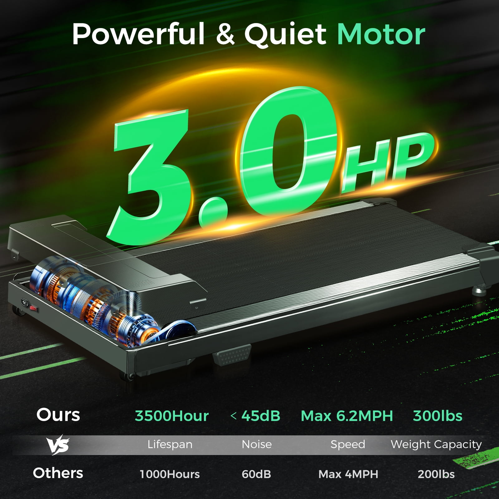 Our walking treadmill for home equip 15 x 41” running belt, it provides plenty of space for your daily exercise and more comfortable experience for your running. This small treadmill could be set on any space in your home or office. Knob for easy fold and store. When folded, it has a total dimension of just 48 L x 22 W x 5.5 H inches.This black compact treadmill equipped moving wheels for easy move and store, please stow the portable treadmill under your bed, sofa, or against the wall. Also our running treadmill equipped walking pad with handle, so please kindly enjoy your sport time and health life. Our 3.0 HP Quiet Motor Portable Folding Treadmill will provide speeds of 6.2 MPH, below 55 db, this running treadmill supports up to 300 lbs capacity.