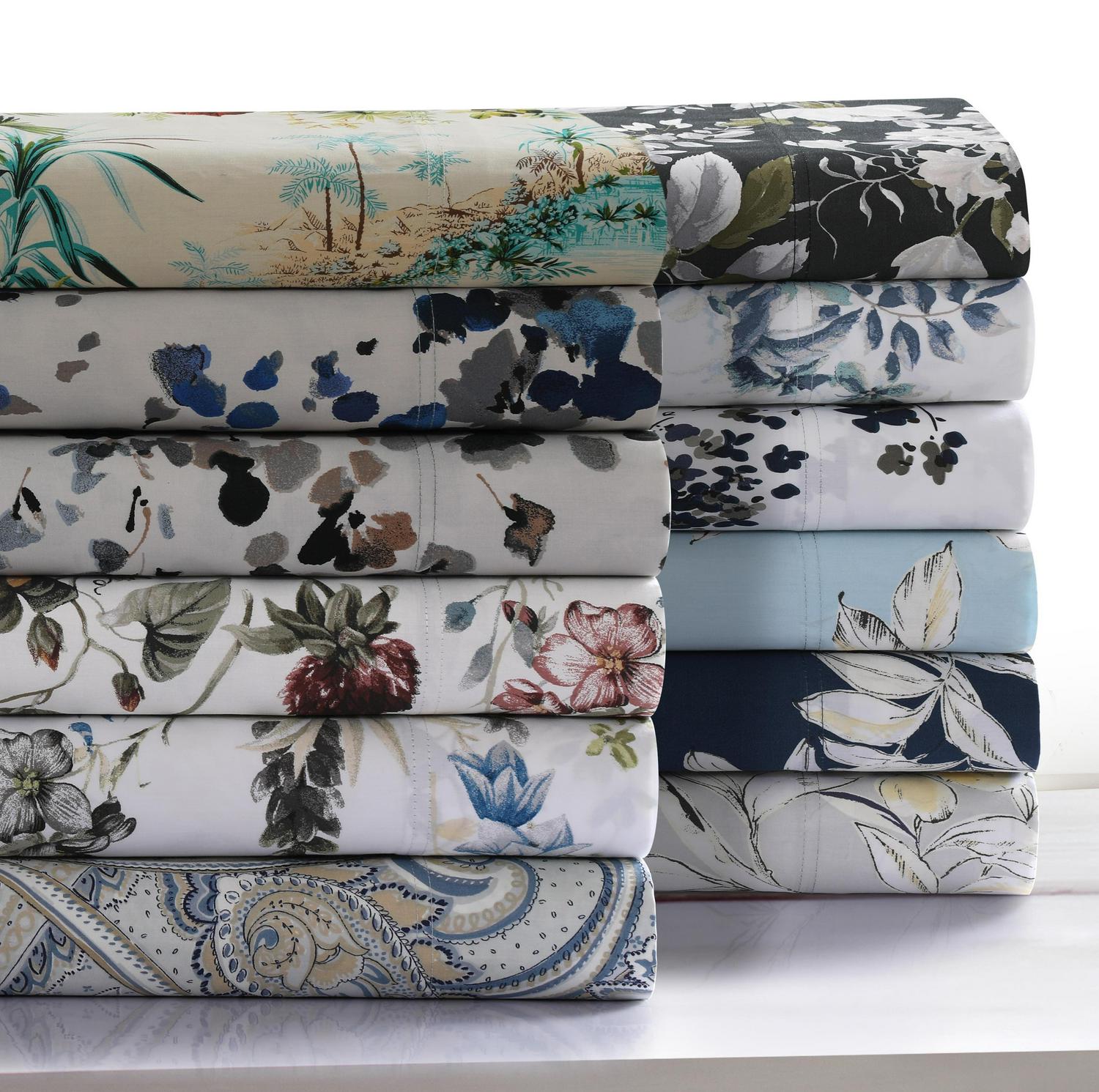 Woven of 300 Thread Count sateen, this 100 percent cotton multicolor printed sheet set features beautiful floral, paisley or tropical pattern. These soft and lustrous sheet sets feature oversized flat and fully elasticized deep pocket fitted sheet to accomodate mattresses up to 22″ deep.
