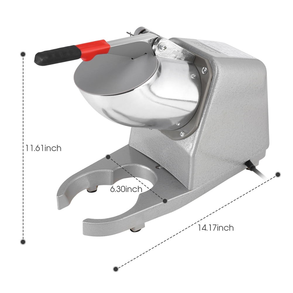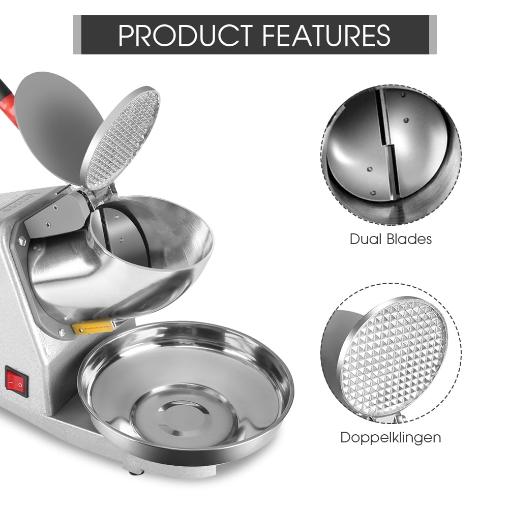 HIGH EFFICIENCY – Electric (plug-in) power does the work for you; Rapidly shaved ice (143 lbs. of ice per hour) to meet large demands easily; The powerful motor and sharp blade provide you soft, fluffy, and powdery snow ice; Higher crusher body and elbow give the machine better aesthetics while allowing more space for containers like goblets, cups, bowls, and so on HIGH-QUALITY MATERIALS – Built with food-grade corrosion-free stainless steel hopper and blade; Rust-proof and hygienic conditions guarantee food safety; Easy-clean mechanics design makes your life easier, saving you energy and time; The food-grade stainless-steel bowl is included for catching shaved ice; Note: please rotate the ice bowl during use COMFORTABLE USE – Heavy cast sturdy base offers stable and quiet workstation; Vibration and noise minimized to keep a relaxed atmosphere and comfortable experience; The ice pick in the package is convenient for you to break up ice and the wooden cover is easy to store when you do not use it DETAIL ORIENTED – Water resistant on/off switch for convenience and peace of mind; Blades stop rotating and the power shuts off automatically when the hopper handle is open to avoid injury; The roller on the outlet is helpful to prevent ice from splashing, giving you an enjoyable ice-making experience AESTHETIC DESIGN – The elegant and clean appearance makes this ice machine more attractive in your kitchen; Perfect for homes, fast-food stores, restaurants, cafes, bars, clubs, canteens, snack stands, festivals, fairs, etc