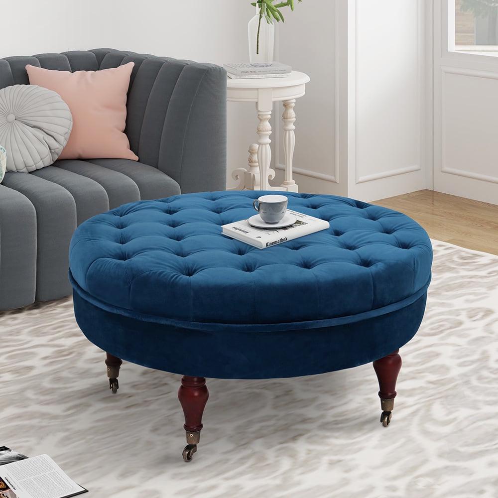 32 in. Navy Velvet Upholstered Round Cocktail Ottoman with Wheels