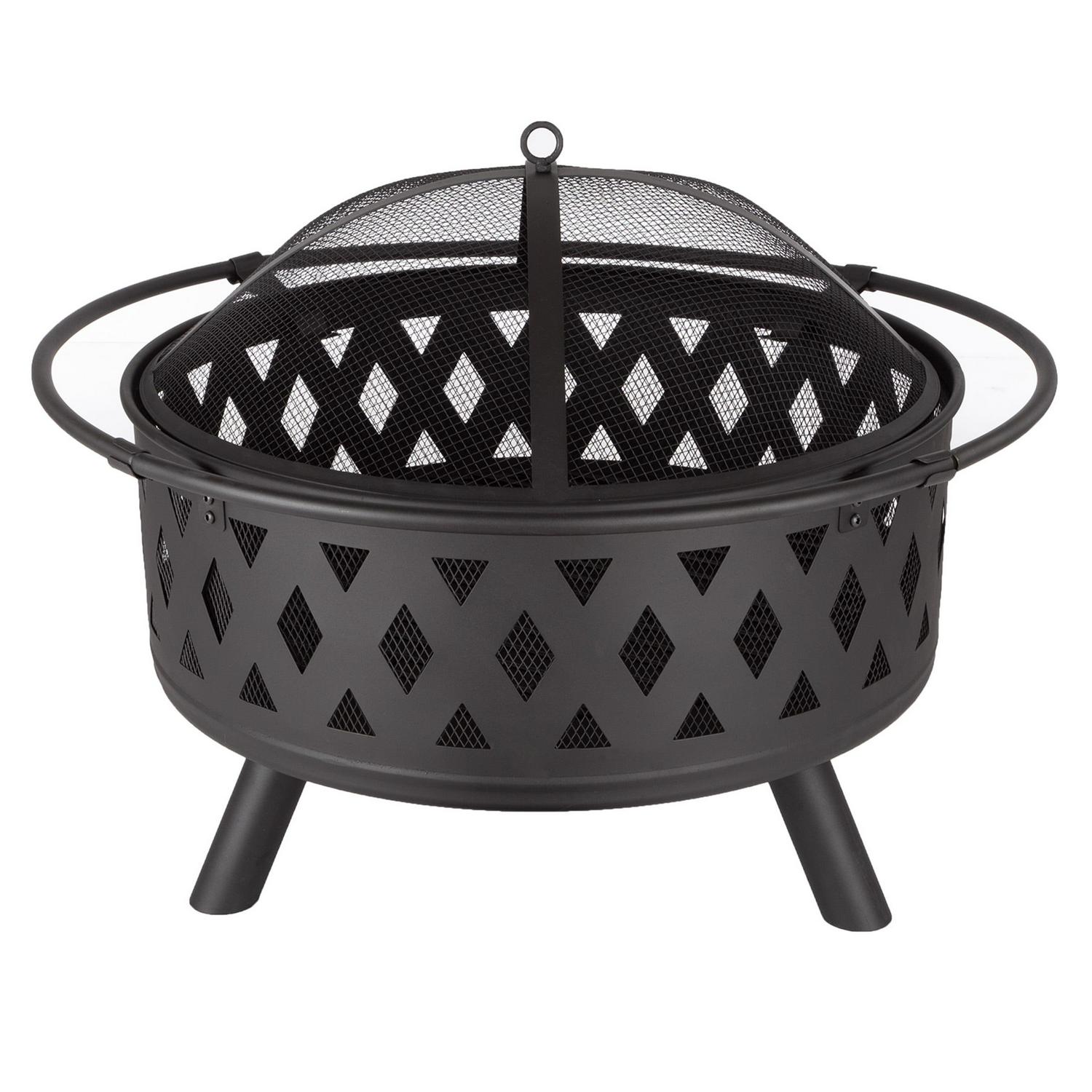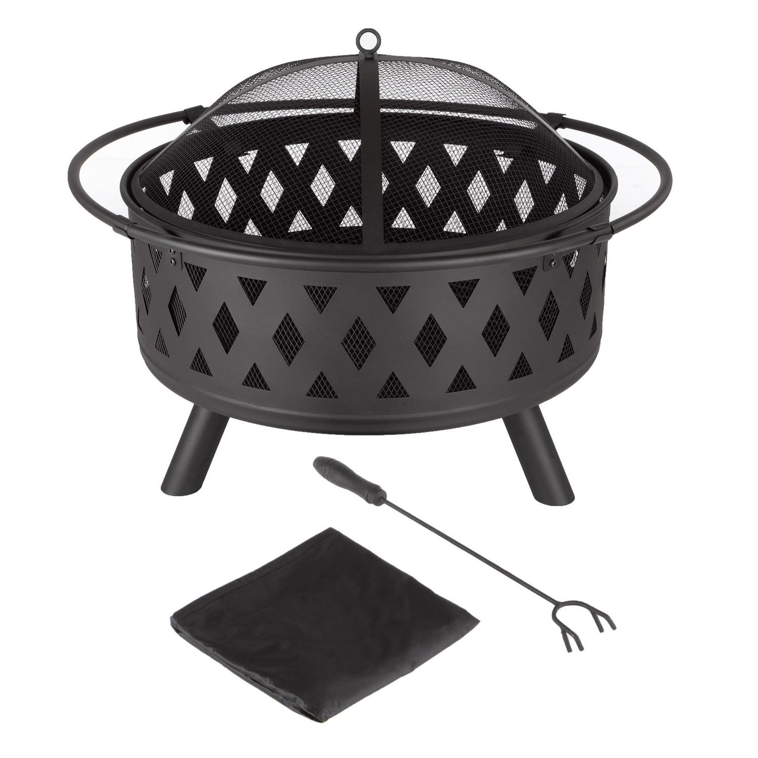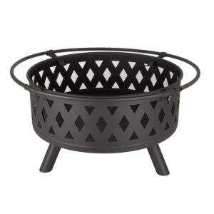 PRACTICAL DESIGN The powder-coated fire bowl is an ideal blend of modern design and natural elements with its cross-weave pattern cutouts. With the mesh spark cover, log grate, and fire poker, this bonfire pit is fun for the whole family.