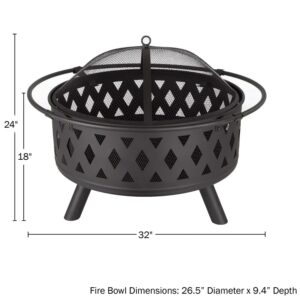 The 32-inch Wood Burning Fire Pit by Pure Garden has a black powder-coated finish that is attractive to match any outdoor living space décor. The 26.5-inch fire pit table features a round steel bowl is designed for wood burning with a cross-weave pattern of cutouts for ambiance, a mesh spark screen for safety, a 16-inch log poker, and a convenient storage cover. Enjoy the warm glow of this firepit table for outside on your patio and set the atmosphere for a relaxing outdoor experience on a cool summer night or crisp fall evening.