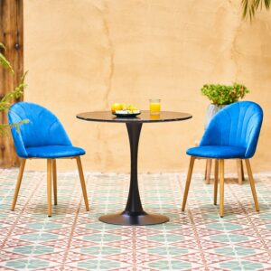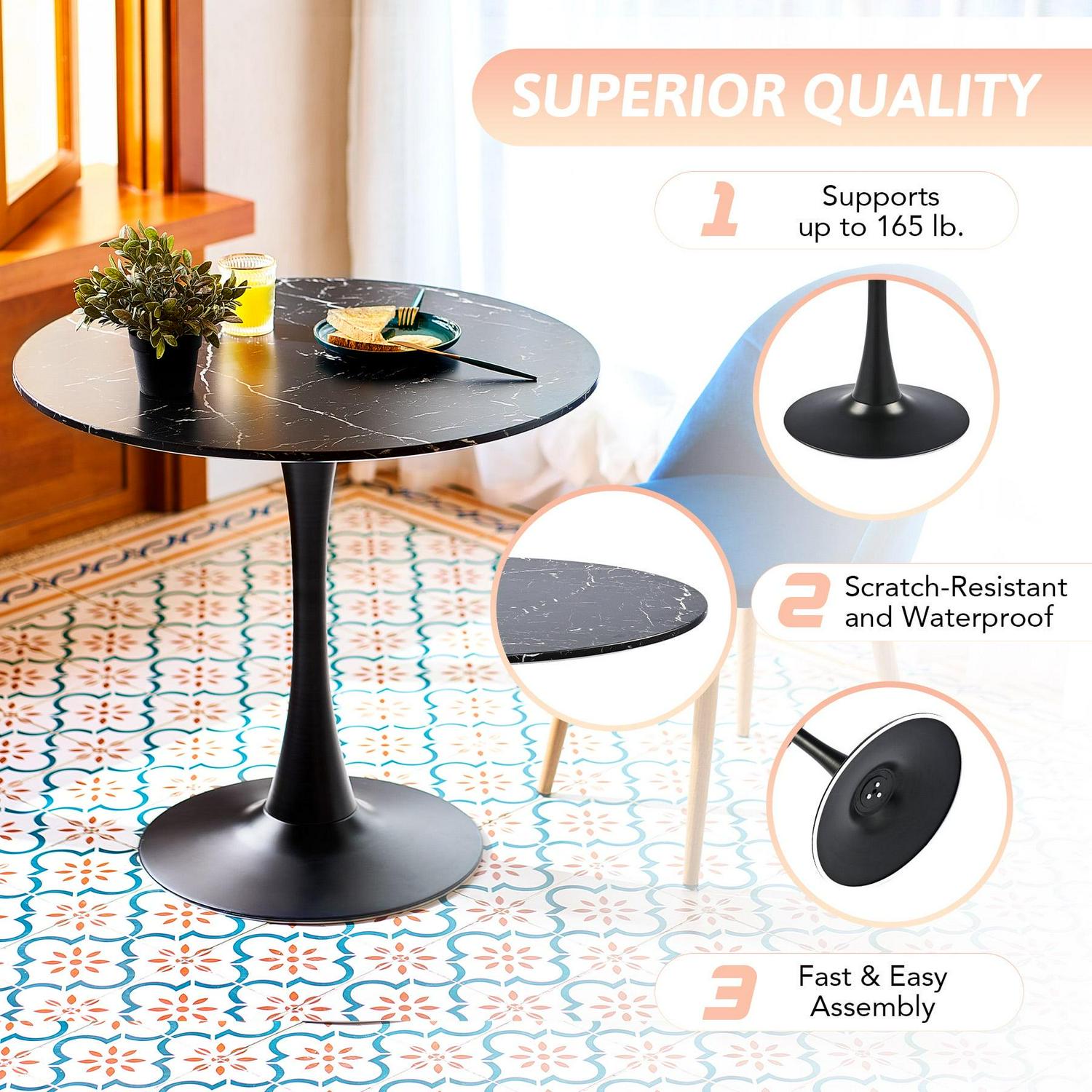 This understated round dining table smartly combines a sleek shape and vintage marble accents, instantly bringing your dining and entertaining experience to a new level. Measuring 31.5 inches in diameter, our kitchen table has a small footprint but still works well in spaces both small and large. Perfect for everything from impromptu family parties to card games with friends, this dining room table carves out a relaxing dining nook for parties of 2 to 4. The MDF tabletop and sturdy metal frame strongly hold up to 165 pounds. Don’t be fooled by the beauty of the tulip base to assume this table is a delicate piece of furniture. The tulip metal pedestal not only makes it easy to gather chairs around but also makes the dreaded table-wobble a thing of the past. Easy to assemble, this functional yet elegant modern accent table is ready to welcome you into the minimalist world and brighten your life for years to come.