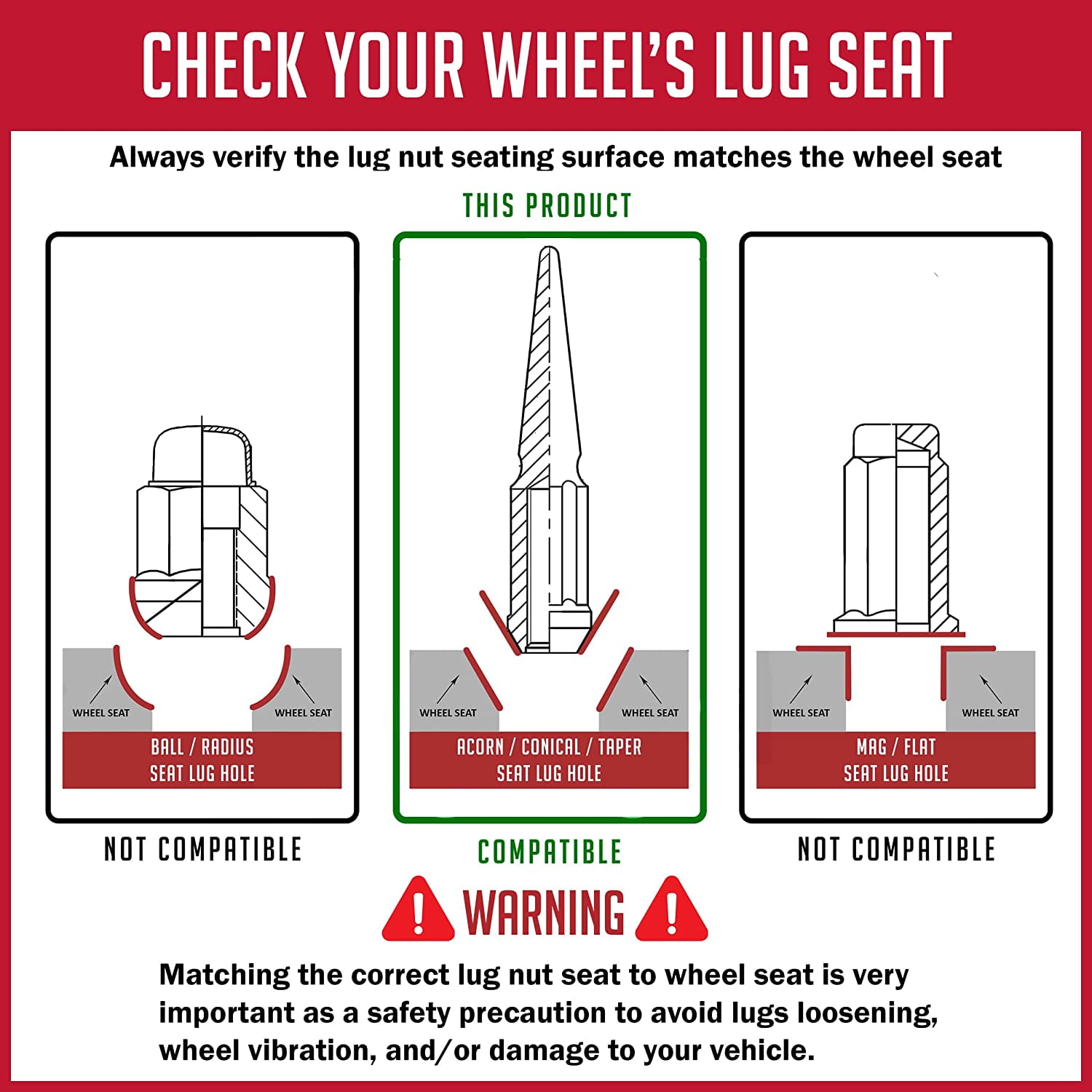 Wheel Accessories Parts 32 Pcs M14x1.5 14×1.5 Thread Spiked 4.4 Long Lug Nuts Chrome Truck Spline Fits 1999+ Chevy Silverado GMC Sierra 2500 3500 | Ford 2005+ F250 F350 | 2011+ Ram 2500 3500 These Lug nuts are designed for AFTERMARKET wheels only. This lug may be the correct thread for your vehicle in many cases the lug seat is not large enough to create enough clamping force to safely clamp the OE wheel to your vehicle. 14mm 1.50 Thread | 4.40 Long | Truck Spline | 60 Degree Conical Seat | Spike Spline Solid Metal | Chrome Finish | 1 Pc Construction | 32 Pcs | Cold forged steel, built to SAE Standards Always use the Fitment Widget ‘Check if this fits your vehicle’ to validate product fitment.