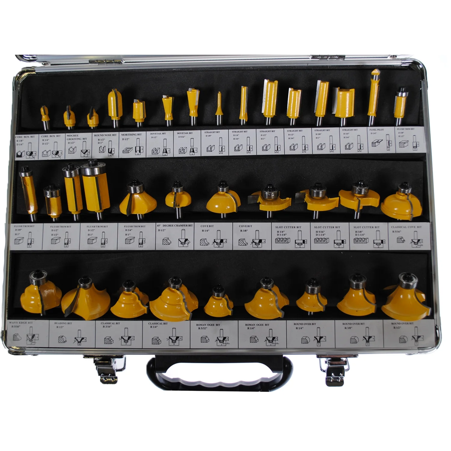 Finally a quality router bit package that has everything you will need to finish your at home or work project. The carbide bits come in 35 different designs at a fraction of the cost compared to buying at a big box home improvement store. High quality, durable long lasting Carbide Bits. BIT SIZE INFORMATION: Core Box Bit: R 1/8″, D 1/4″ Core Box Bit: R 1/4″, D 1/2″ 90 Degree Grooving Bit: D 1/2″ Round Nose Bit: R 1/2″, D 1″ Mortising Bit: D 1/2″ Dovetail Bit: D 1/2″ Dovetail Bit: D 9/16″ Straight Bit: D 1/8″ Straight Bit: D 1/4″, H 3/4″ Straight Bit: D 1/2″, H 1″ Straight Bit: D 1/2″, H 3/4″ Straight Bit: D 3/8″, H 1″ Straight Bit: D 3/4″, H 3/4″ Panel Pilot: D 1/4″ Flush Trim Bit: D 3/8″, H 1/2″ Flush Trim Bit: D 3/8″, H 1″ Flush Trim Bit: D 1/2″, H 1/2″ Flush Trim Bit: D 1/2″, H 1″ Flush Trim Bit: D 3/4″, H 1″ 45 Degree Chamfer Bit: D 1/2″ Cove Bit: R 1/4″ Cove Bit: R 3/8″ Slot Cutter Bit: H 1/4″, D 1-1/4″ Slot Cutter Bit: H 5/16″, D 1-1/4″ Slot Cutter Bit: H 3/8″, D 1-1/4″ Classical Cove Bit: R 5/16″ Wavy Edge Bit: R 5/16″ Beading Bit: R 1/2″ Classical Bit: R 3/16″ Classical Bit: R 1/4″ Roman OGEE Bit: R 5/32″ Roman OGEE Bit: R 1/4″ Round Over Bit: R 1/4″ Round Over Bit: R 3/8″ Round Over Bit: R 1/2″