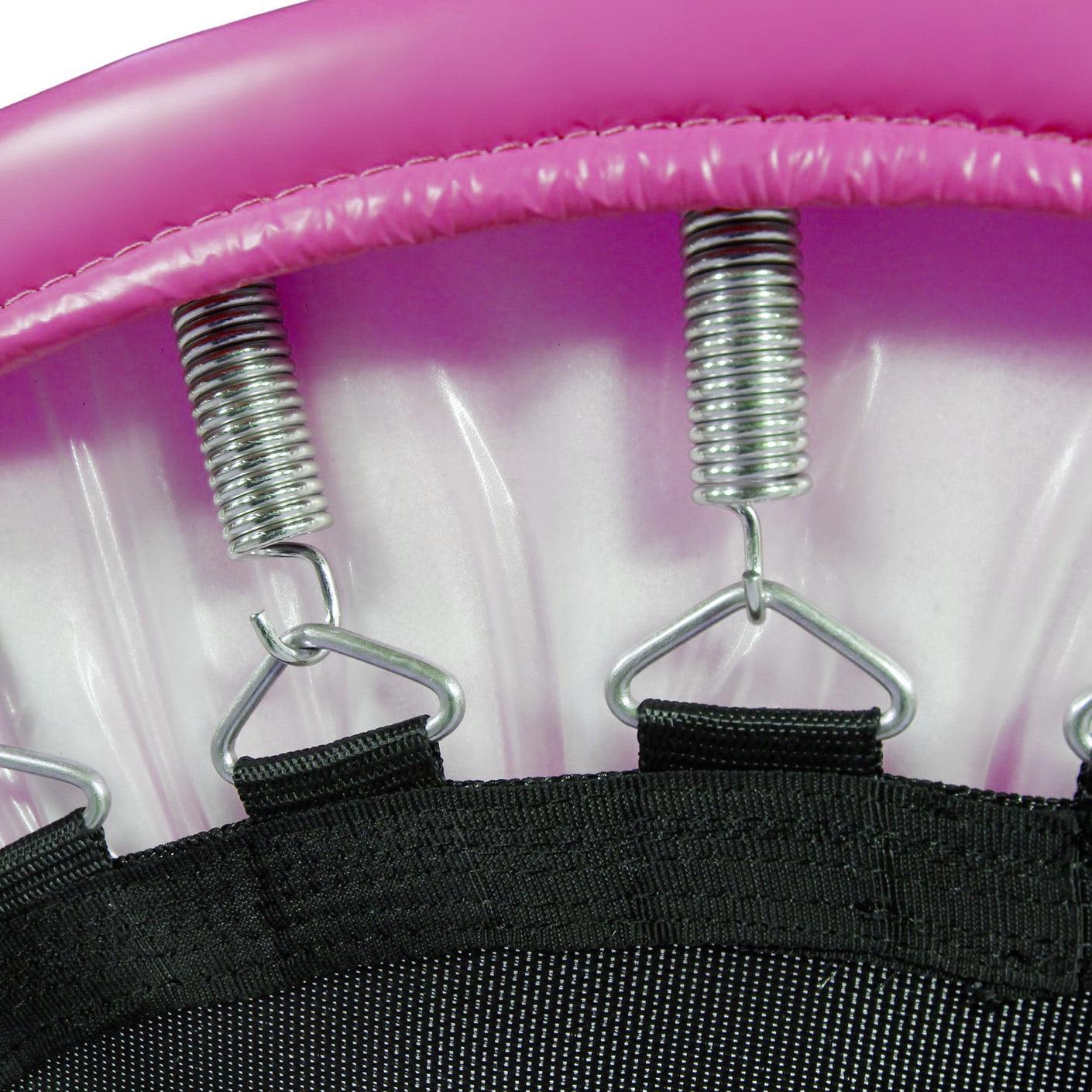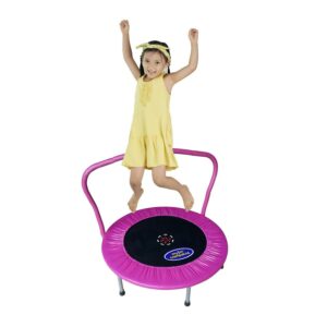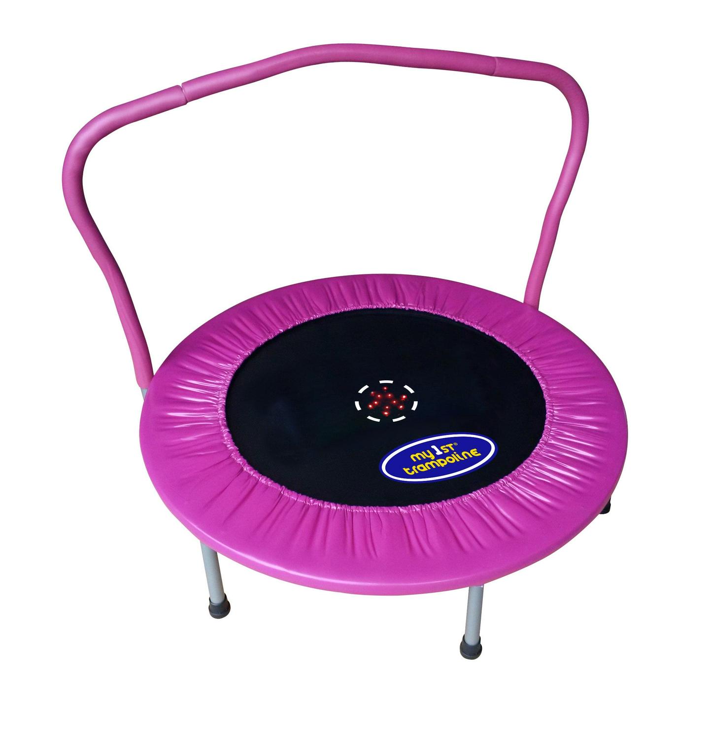 The 36″ My First Trampoline with Flash Light Zone and handlebar is great for girls and boys. They can bounce and engage in physical activity both indoors and outdoors. The 36″ My First Trampoline is constructed with high quality galvanized steel to provide stability and durability. We use steel springs (just like in larger trampolines) in order to provide a deeper, smoother bouncing action for the kids instead of using cheaper elastic bands. The springs are covered by a brightly colored thick PVC protective pad for extra safety. The included handlebar provides kids with extra stability when jumping. Plus, the flash light zone adds flashing lights with every bounce. The 36″ My FIrst Trampoline is easy to assembly and is easy to move around depending on where it will be used. The flash light zone is simple to install–just add batteries (not included) and connect the bungee cords to the “V” rings and you are ready to go. Like all My First Trampoline branded trampolines, the 36″ Mini Trampoline is made with quality in mind, and meets or exceeds all ASTM Safety standards. The maximum weight limit is 200 lbs with a maximum of 1 user at a time. Kids will have hours of fun playing on the My First Trampoline and will get necessary exercise at the same time. Available in 2 vibrant colors: Blue and Pink.