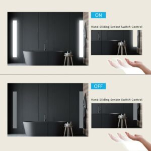 – Inductive Switch Control This led mirror medicine cabinet uses a unique hand sliding sensor switch design, which means that the led mirror can be easily opened or closed without touching the mirror. When your hands are stained with water or other stains, compared with the LED mirror medicine cabinet with a touch switch, you can turn on the LED mirror more conveniently and without leaving water or stains on the mirror. You don t need to frequently Scrub the mirror.