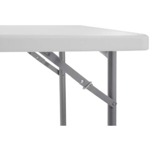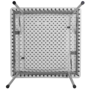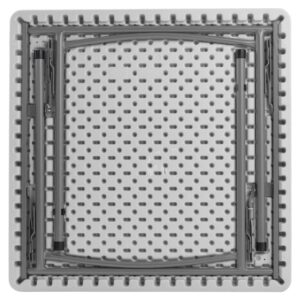 Our square blow-molded plastic folding table is the perfect solution for home, office, picnic and cafeteria use. Suitable for indoor or outdoor in any application that calls for affordable, lightweight, weather-resistant and highly durable folding tables. Their lightly textured design keeps them scratch-resistant yet still enables a surface smooth enough for writing. The plastic tabletop is heat-resistant up to 212 degree F and designed with a non-bowing eggshell structure for fortification to hold up to 500 lbs. of distributed weight! The tabletop color is a light speckled gray matching the textured gray powder-coated steel frame. The legs are straight style and feature gravity slide locks which maintain the table’s overall strength and support. Lightly textured surface to resist scratching yet smooth enough to write on. Lightly spotted grey top w/ grey textured powder coated straight shaped legs on a square tabletop. Can withstand heat up to 212 degrees Fahrenheit. Gravity slide lock or snap lock, for extra stability. 19-Gauge Strength Frame And 19-Gauge Legs. Attractive Arched tube leg connectors for added strength.