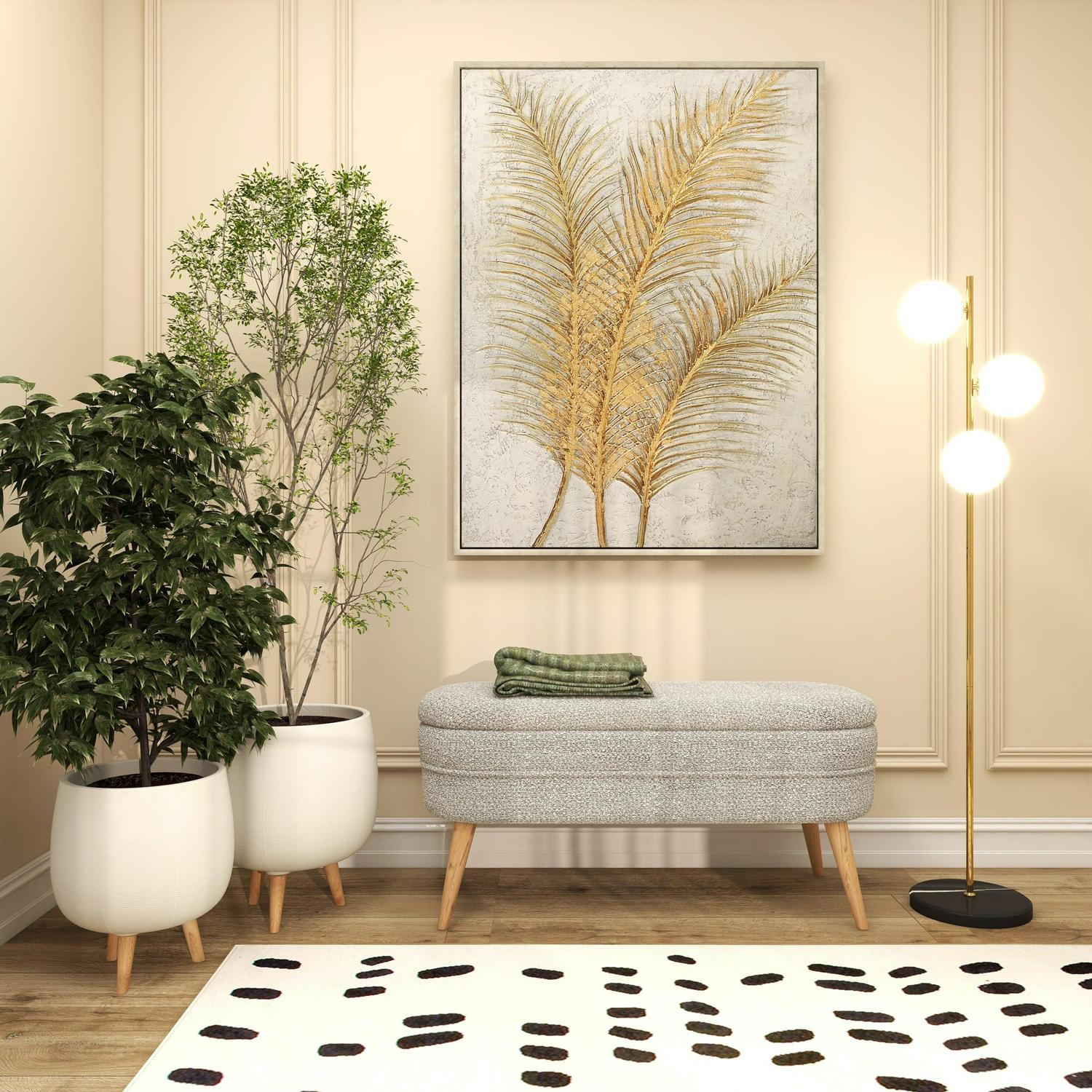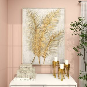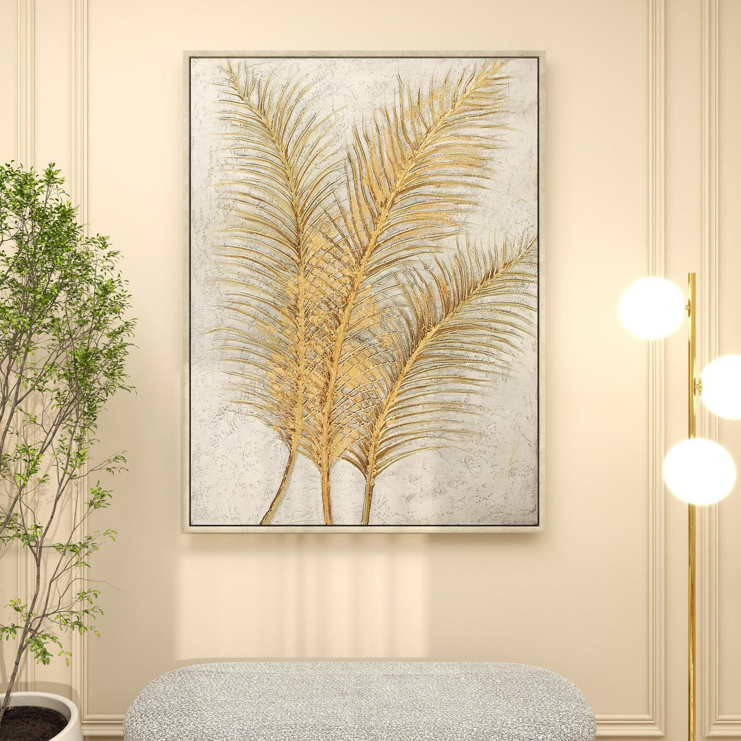 – Gold leaf wall art features a silver wooden frame and a 2D textured palm leaf painting in metallic gold, smoky gray, and white finishes