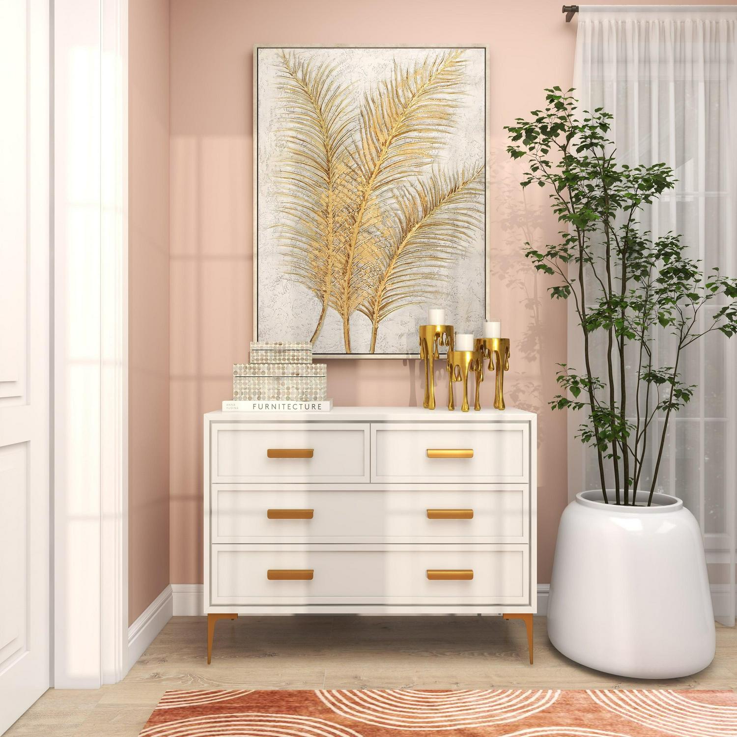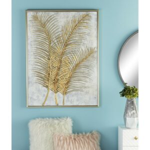 – Framed wall art showcases three large palm fronds with a metallic gold acrylic finish and low relief feature, adding dimensional layers over a distressed whitewashed background