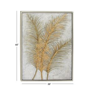 36″ x 48″ Leaf Framed Wall Art with Silver Frame, by CosmoLiving by Cosmopolitan is a unique addition to your stylish home. This wall art exude natural beauty and sophistication in both color and composition. Showcase your personality and turn your walls into an art gallery with this impressive wall art. Add a bold statement to your living room or bedroom space with this palm leaf wall art that complements your wall sconces, indoor plants, or console tables for a chic upgrade to your glam interior. This item ships in 1 carton. Can be hung vertically using the sawtooths on the back; nails and screws not included. Suitable for indoor use only. This item ships fully assembled in one piece. This is a single gold colored canvas wall art. Glam style.
