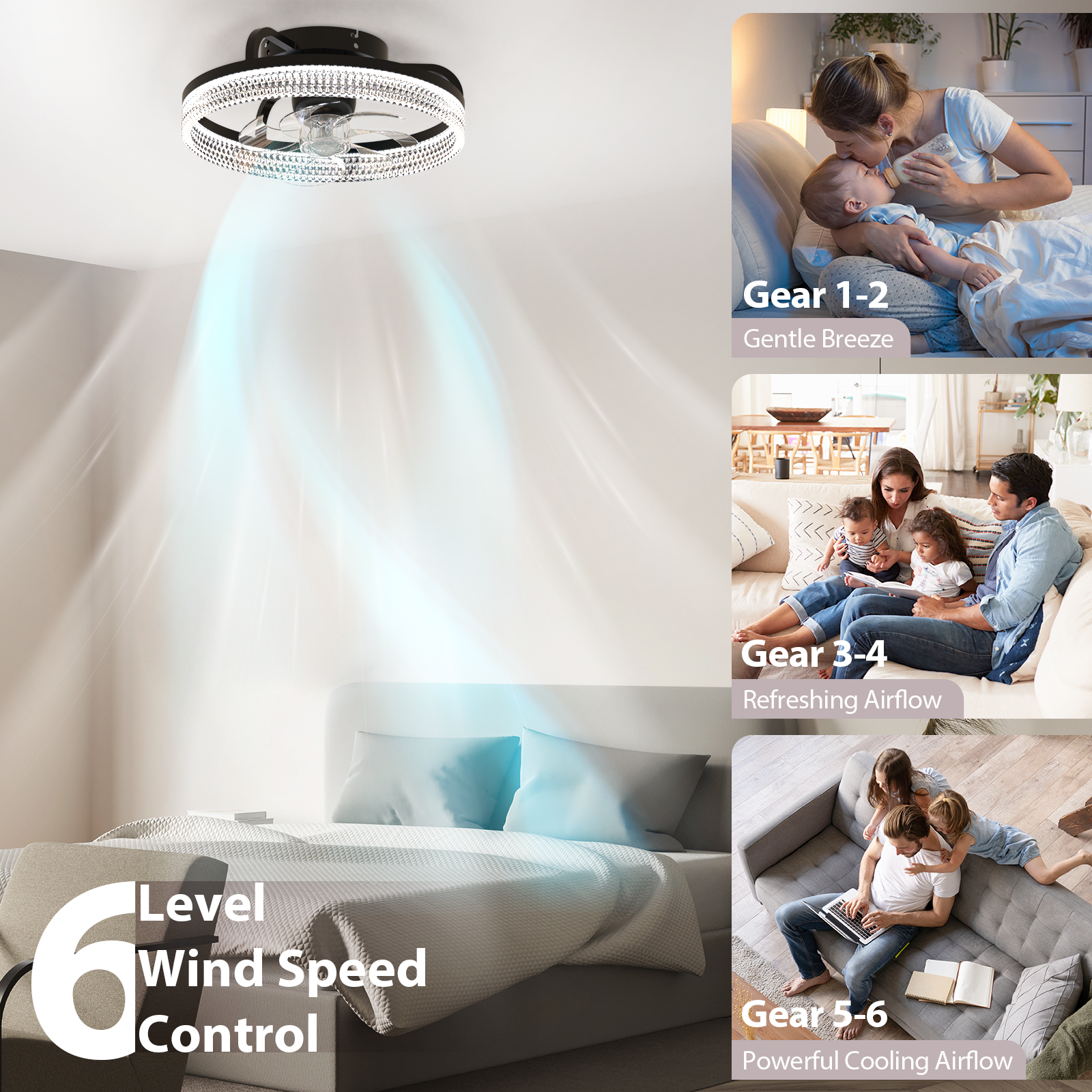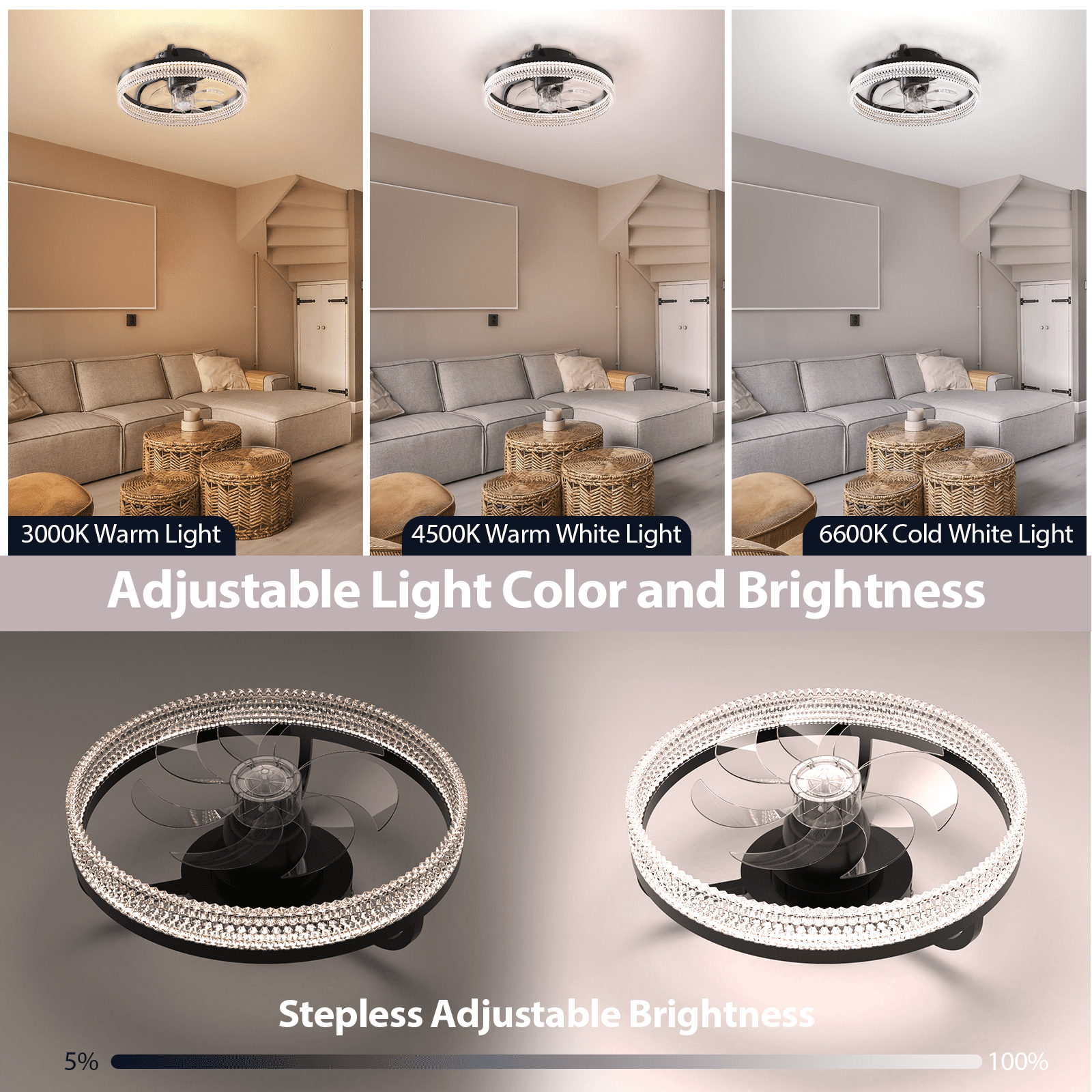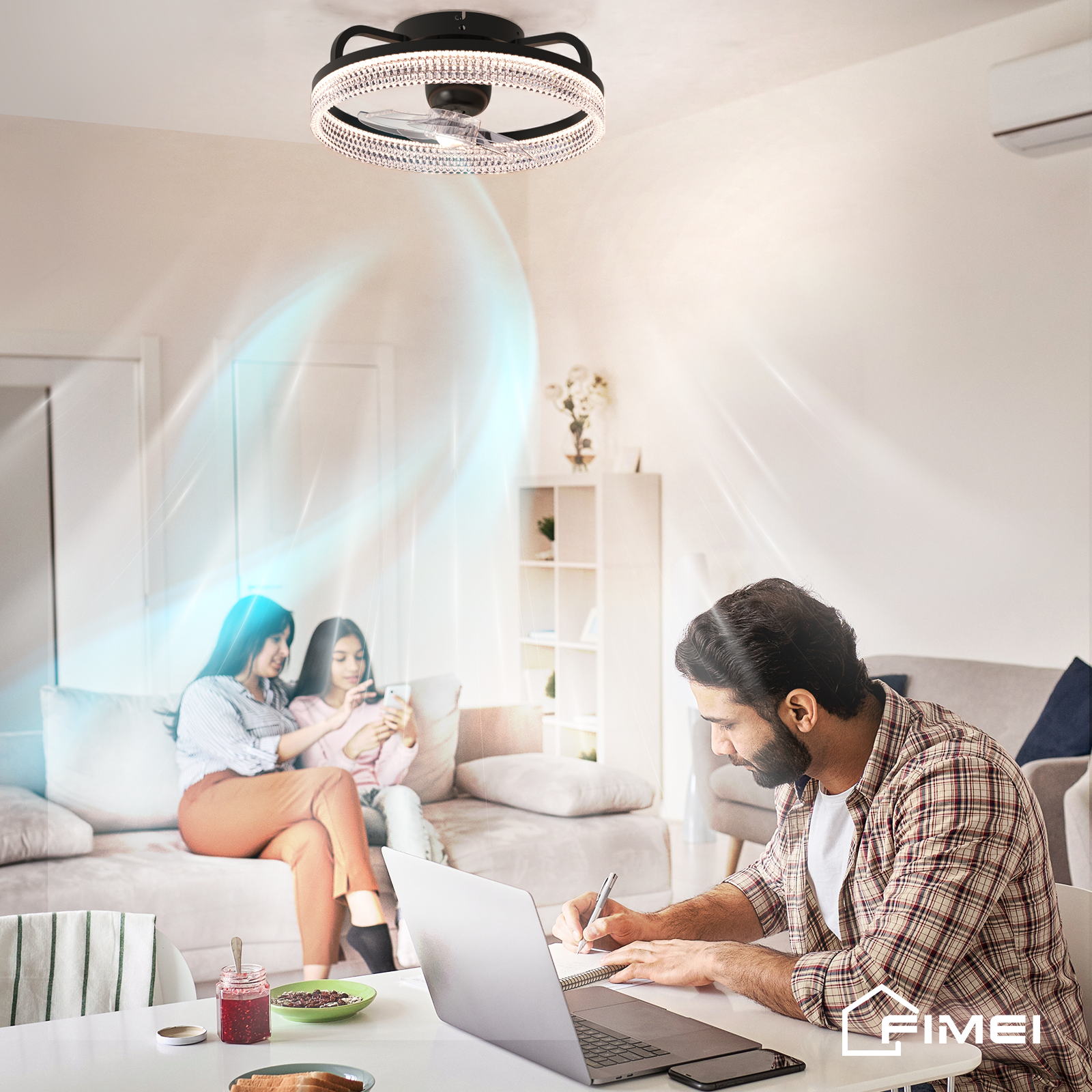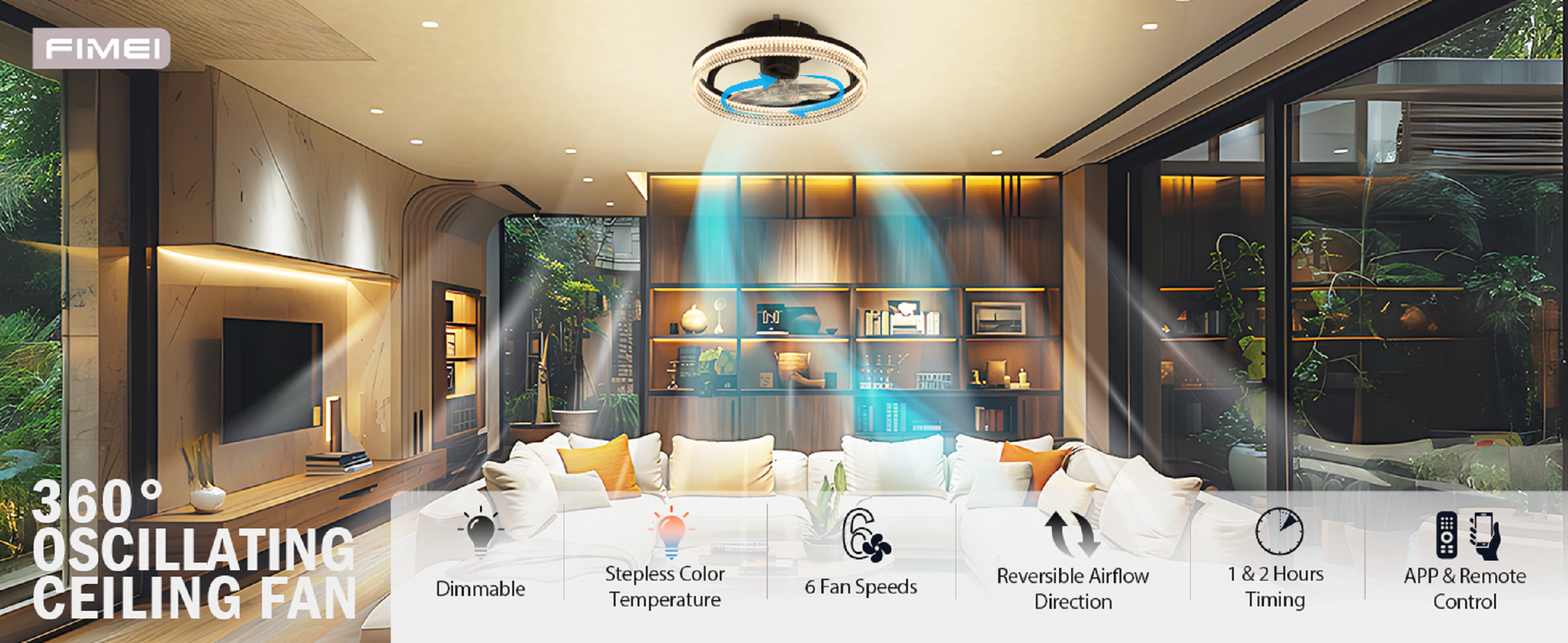 【360°Oscillating Ceiling Fan】 This FIMEI 360°oscillation ceiling fan can shake head but also focus the airflow in a specific direction. Even though it’s only 19.7 x 19.7 x 6.1 inches, it effortlessly fills the room with a refreshing breeze. The propeller-style design and large-angle black fan blades expand the effective range of air circulation, optimizing both comfort and space utilization. 【3-Color Dimmable LED Lighting & Memory Function】 With 3 selectable color temperatures (3000K/4500K/6600K) and stepless adjustable brightness ranging from 5% to 100%, you can customize the lighting according to various activities such as parties, work, or reading. It also features a memory function, remembering your last brightness setting for convenience. The ceiling fan utilizes a replaceable LED light board and offers enhanced functionality. 【Reversible & Quiet Motor & 6 Speed Options】Reversible function allows it to effortlessly switch from the downward airflow in summer to the upward airflow in winter using the remote control, provides a better air circulation. Benefit from 6 adjustable speed settings and noise levels from 20-40 dB, ensuring energy efficiency and peaceful operation. 【Convenient Remote, App Controls and 1-2 Hours Timing】The inclusive remote offers all operation features, such as 1-2 hours timing, 6-speed settings, 3 color temperatures, dimming features, reversible airflow etc. Also, you can use the app to add flexibility across different scenarios. The wall switch can turn on/off the light or switch the light color. NOTE: Remote is packed with the controller at the bottom of the packing box. 【Delicate Ceiling Fans for Perfect Decoration】The LED lamp shell of the ceiling fan is made of high transparent acrylic. High strength iron frame keeps the fan stable be mounted on the ceiling. With the modern designed outlook of the lamp shell, perfect decoration for your beautiful room. 【Easy to Install】Please confirm the size of the ceiling fan you need before ordering. The product comes with all necessary accessories and a graphic description manual, so you can finish the installation within a short time. If you have any questions, please feel free to contact us, so that we can solve it for you in a timely manner.
